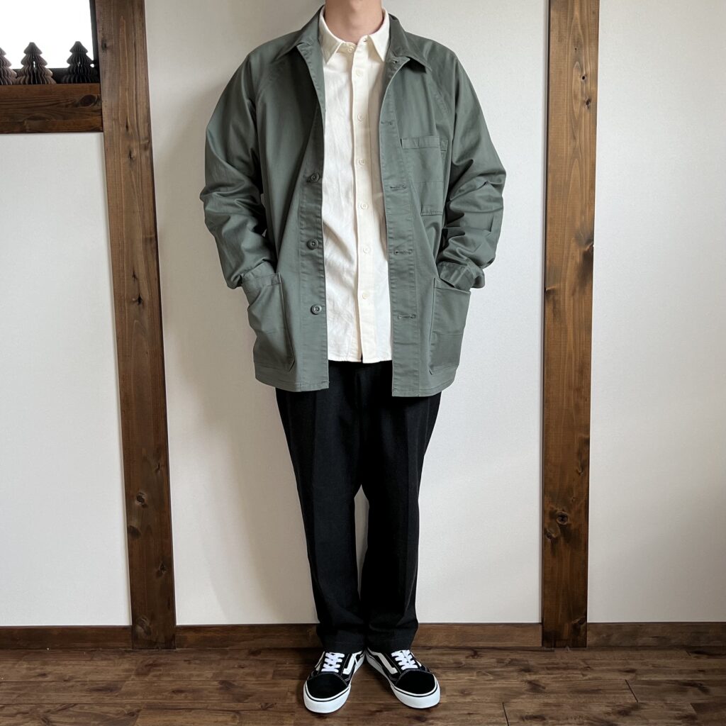 身長170cm、体重60kgの僕はLサイズを購入しました。全然Mサイズでも大丈夫でしたが、ややオーバーサイズなサイズ感にしてみました。今回は中は白のバンドカラーシャツ、パンツはデニムというとてもベーシックなコーデにしてみました。内側に持ってくるアイテムとしては白や黒、グレー系が使いやすそうですね。