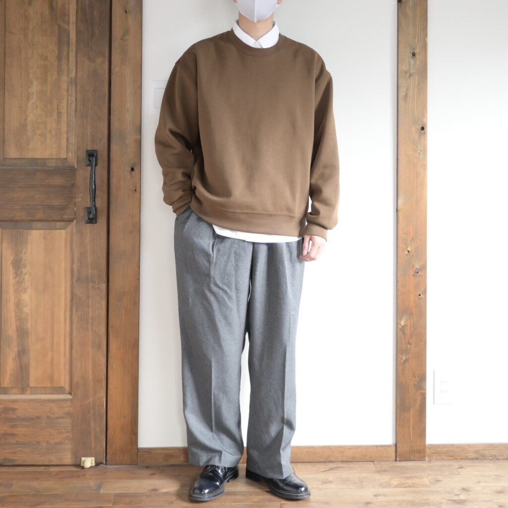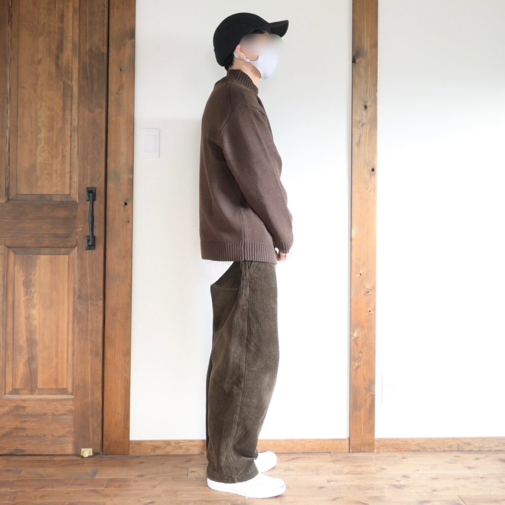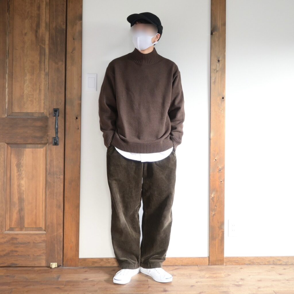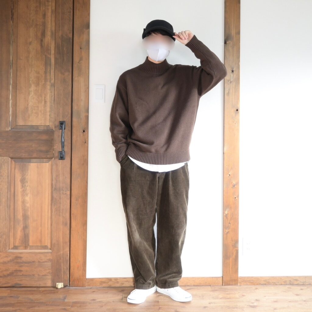 上下ブラウンって私服として大丈夫かな?と感じる方もいると思うんですが、今回のコーデのようにシャツやスニーカーで白を取り入れてあげると、コーデが重くなり過ぎず良いかなと思いました。ハイネックのセーターなので、まだ出番は先かなと思うんですが、このニットはこれからの時期に使いやすいと思うので、個人的にかなりオススメです。