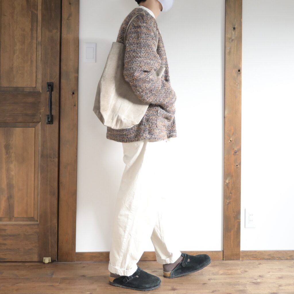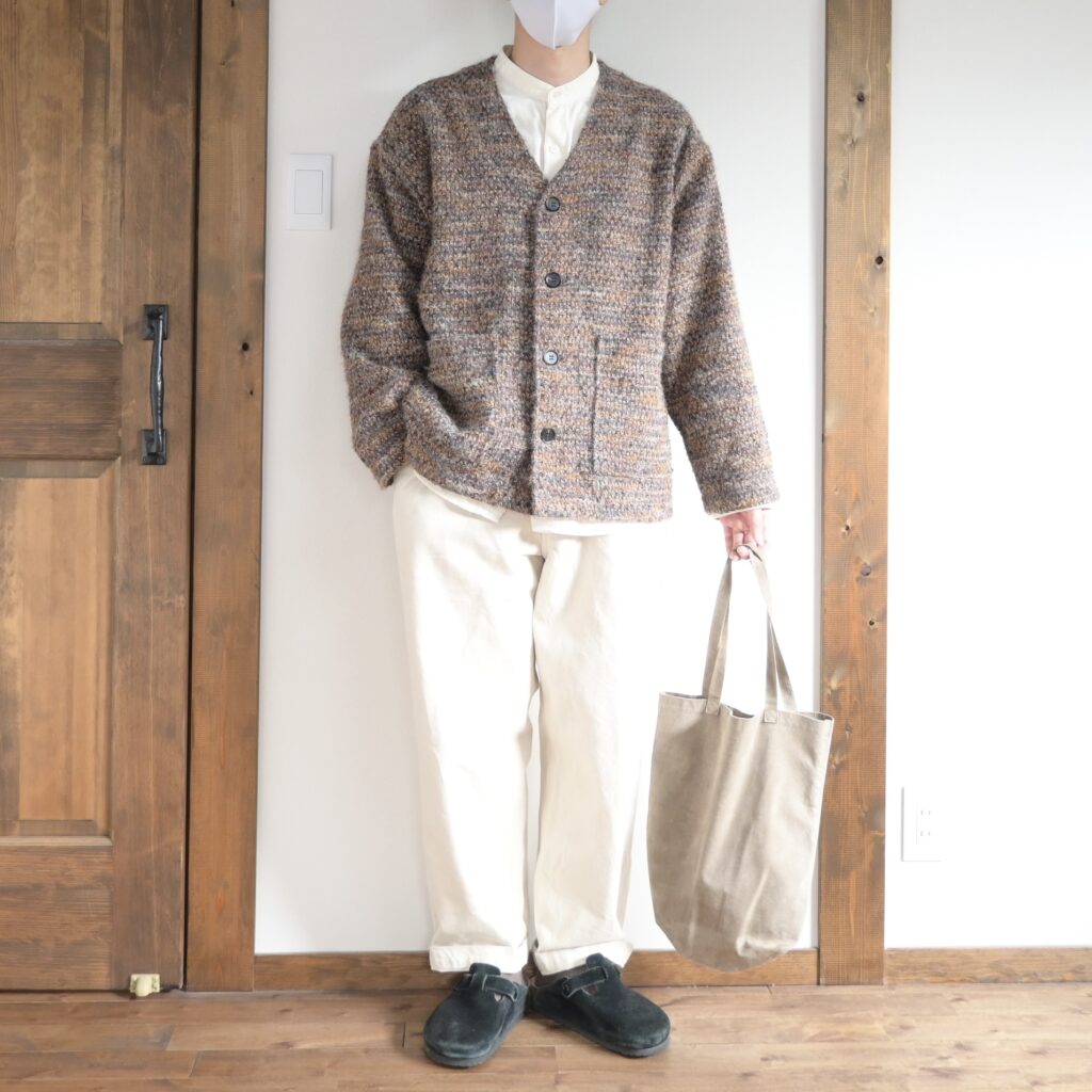 表面が毛羽立った絨毯みたいな素材のカーディガンで、古着っぽくて気に入っています。シャツもパンツも生成りカラーで、カーディガンのブラウンが映えるように合わせてみました。全体的に同系色でまとめてみました。