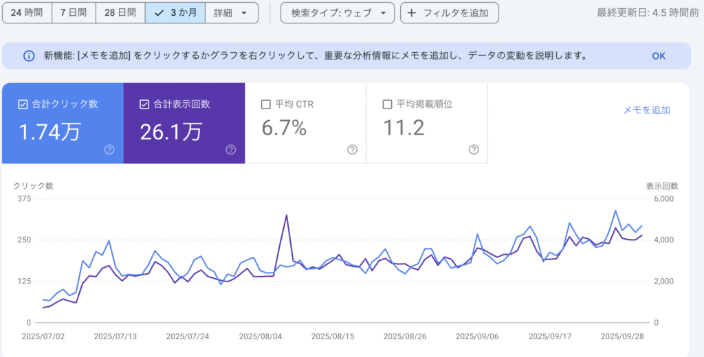9月後半あたりからPV数増えたな〜と感じる日が増えました。「まぁ一時的なアレかな?」とあまり気にしていなかったんですが、ブログとかYoutubeをやっている方はご存知のGoogleサーチコンソール(通称サチコ)で直近3ヶ月のアクセス数や平均掲載順位の変化を調べてみると、なんだか表示回数も掲載順位も凄く伸びてる!