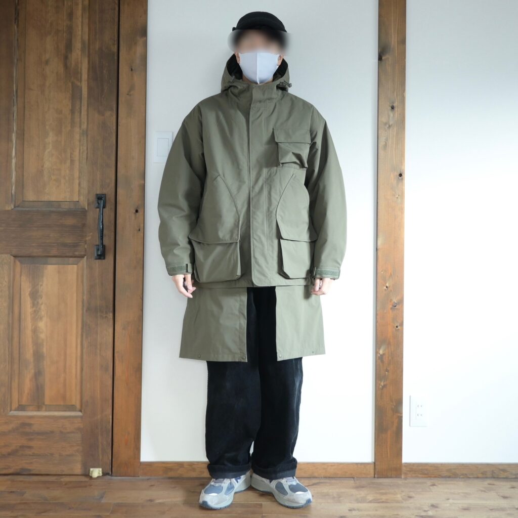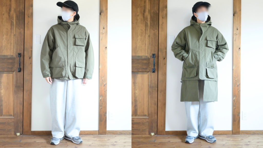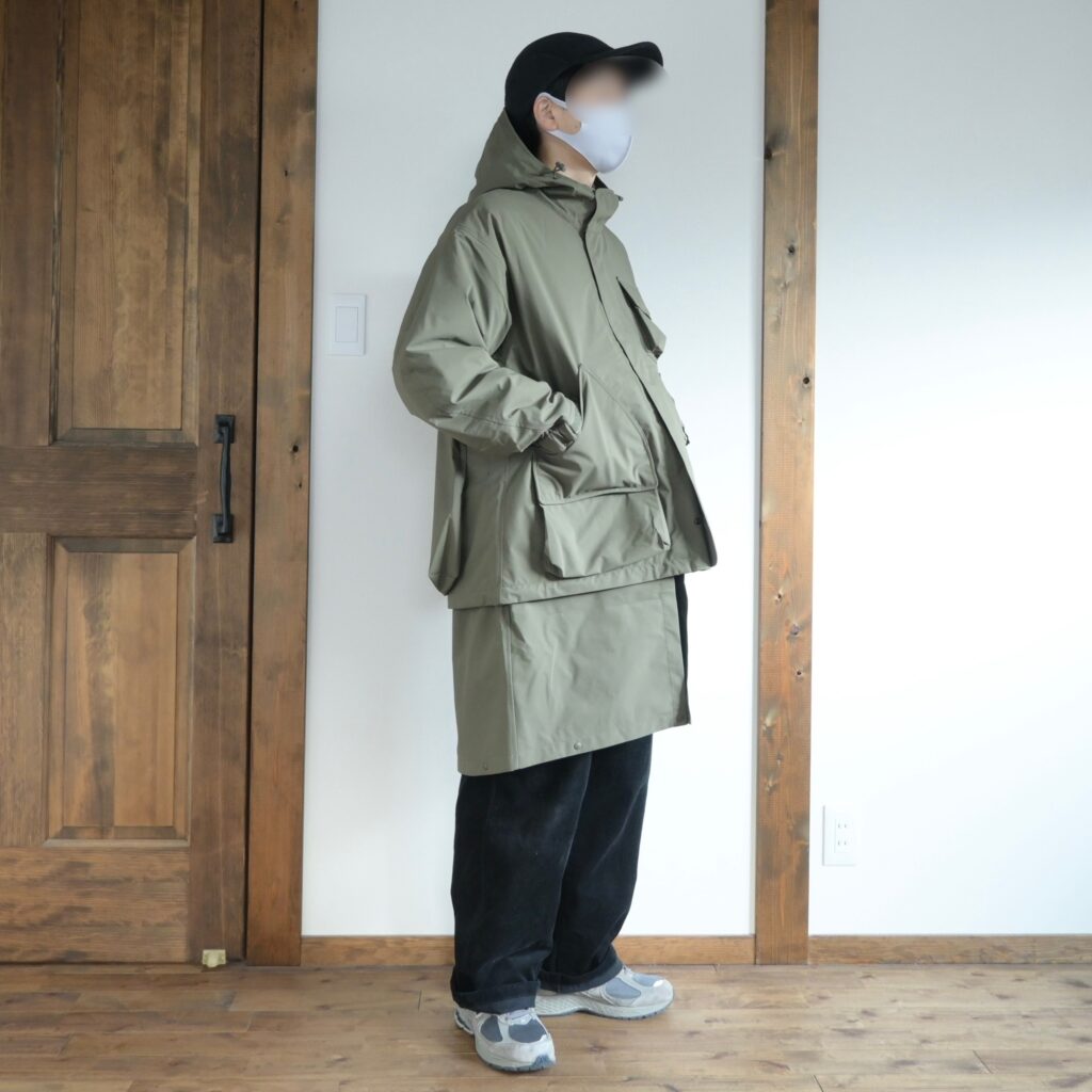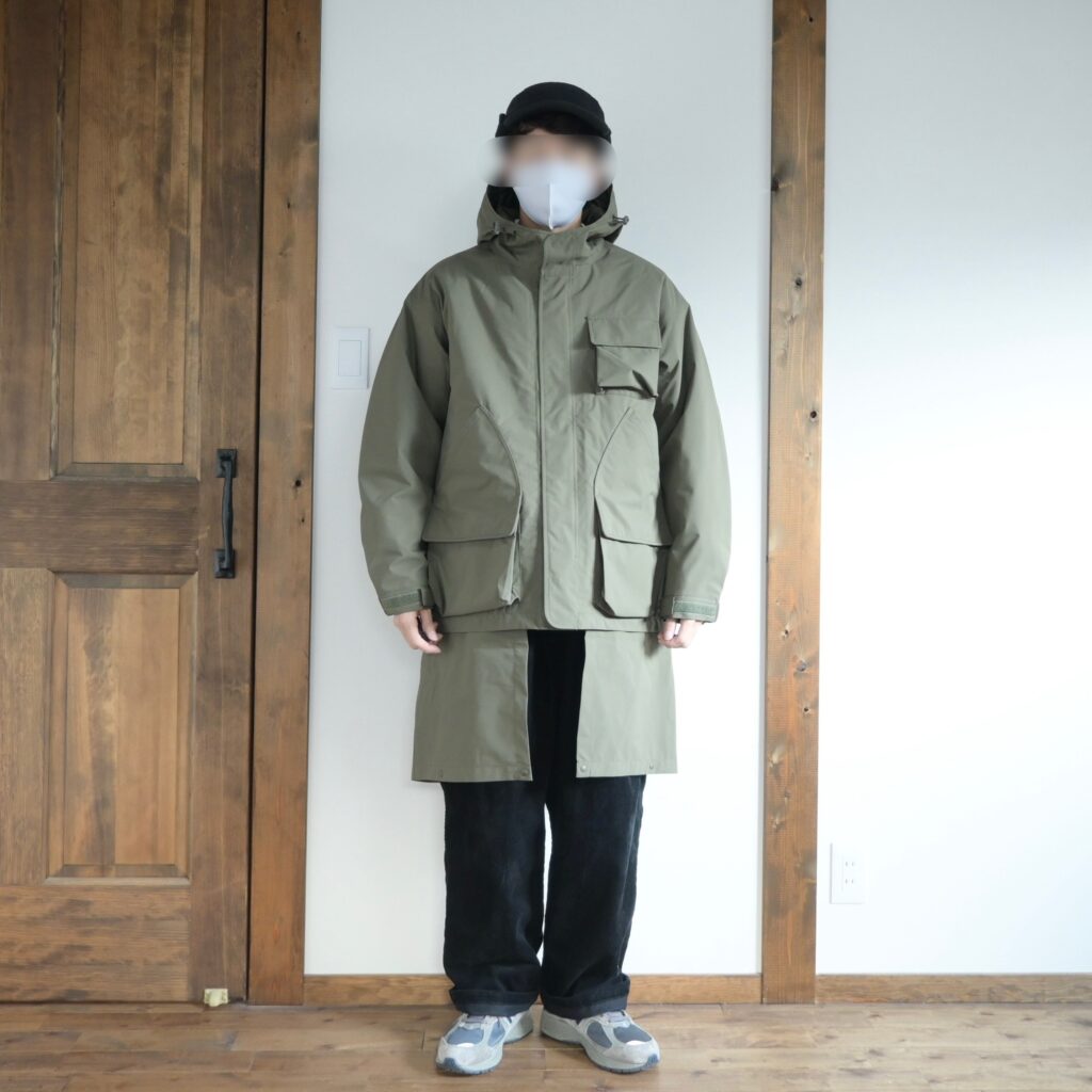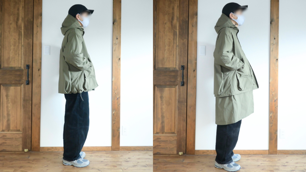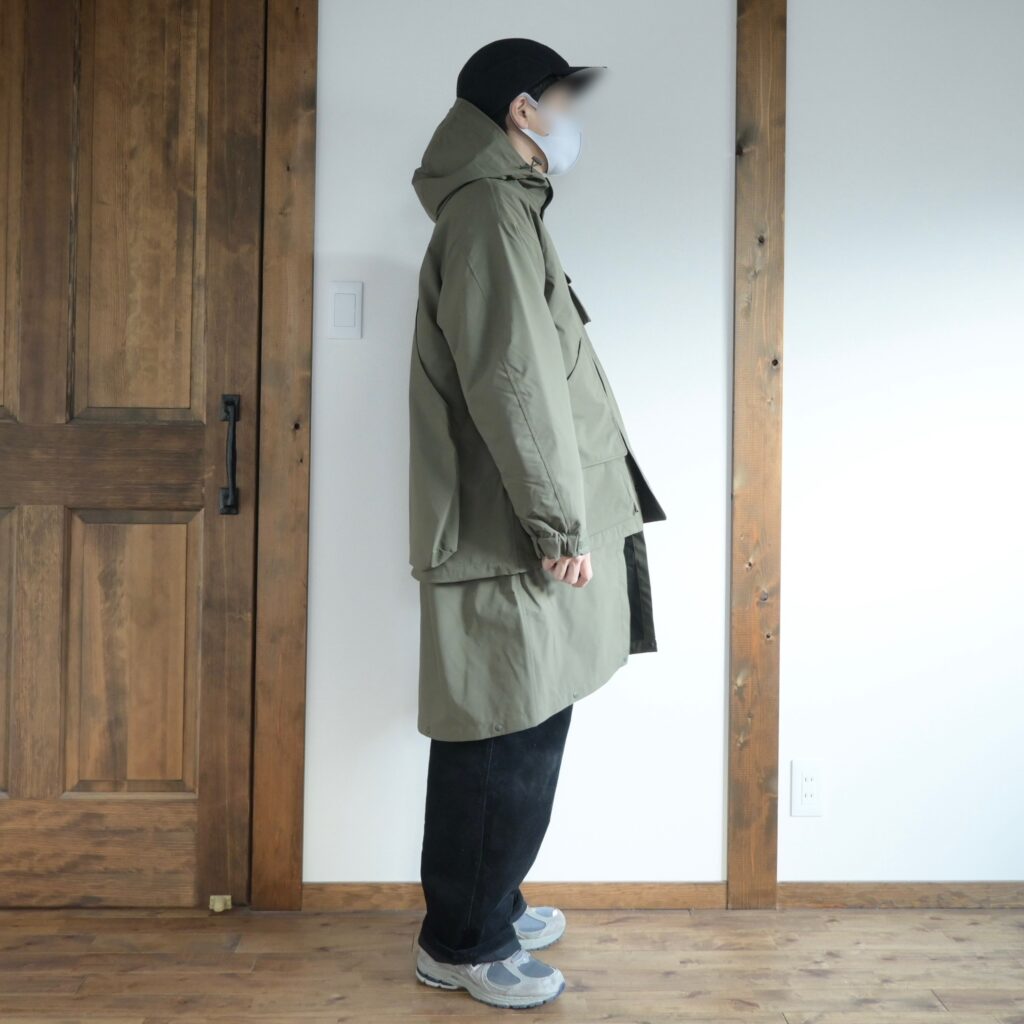 逆にロング丈でのみ着るのであればサイズUPして着るのも良いかなと思いましたが、僕の場合はどちらの状態でも使うと思うのでMサイズが適正だったと思います。