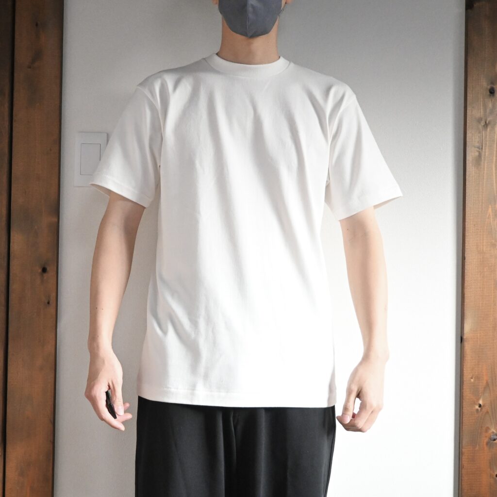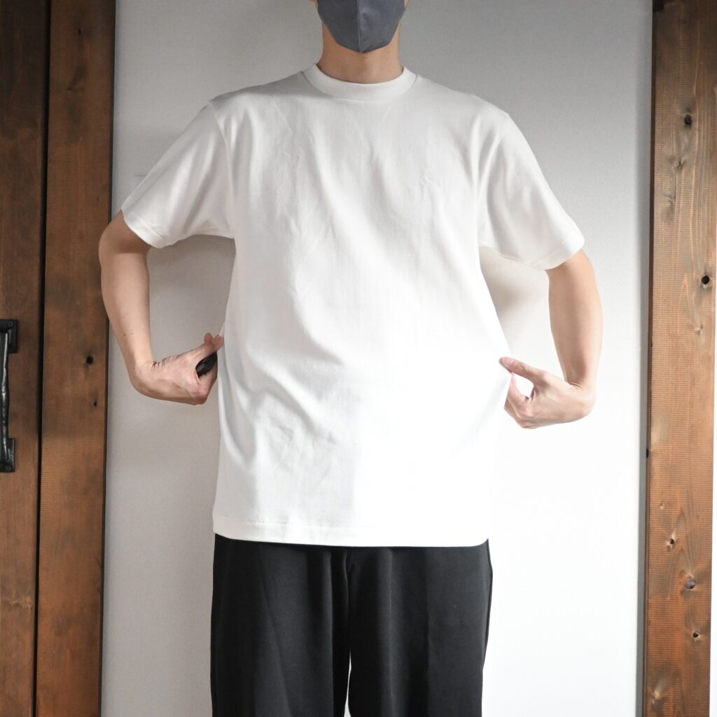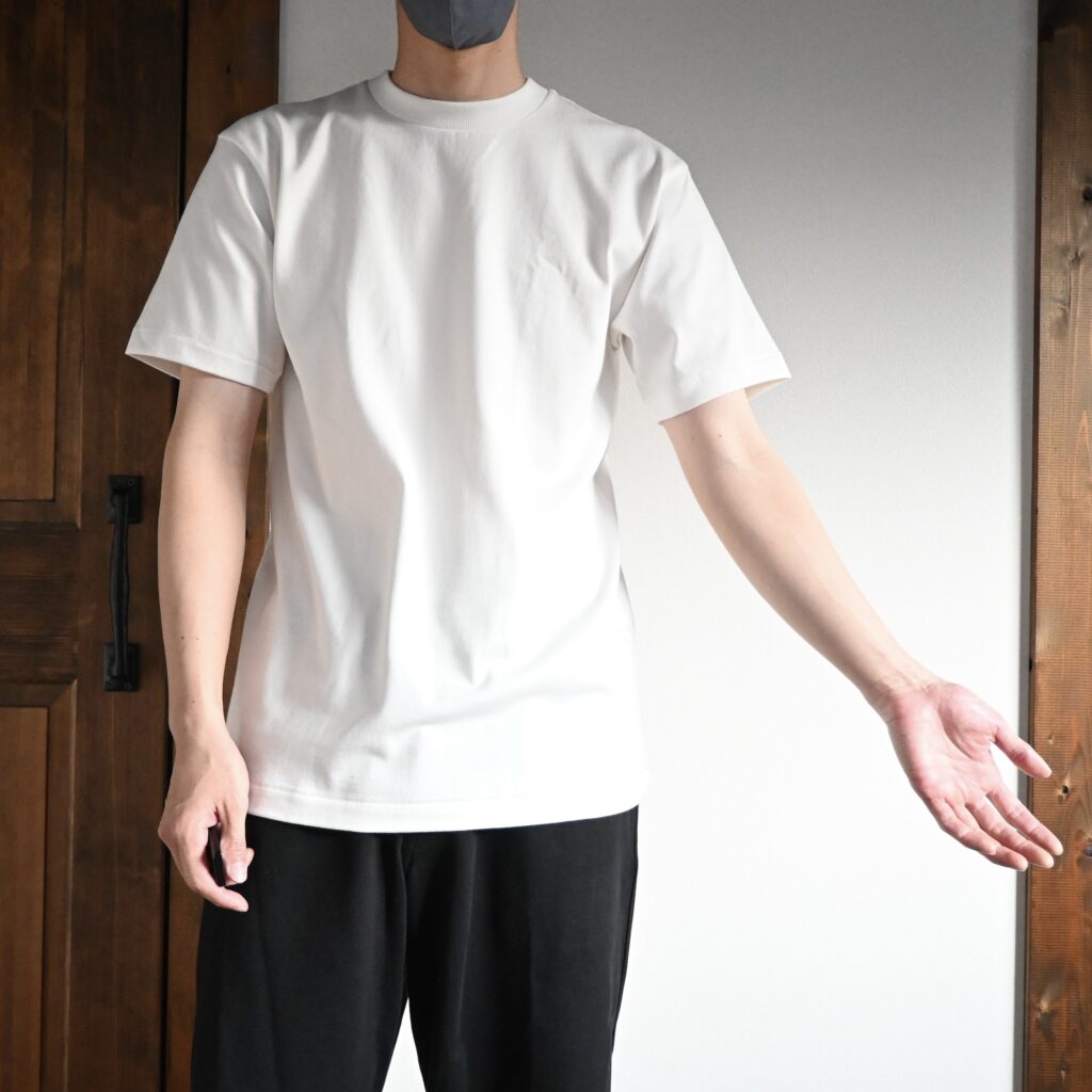 7.0オンスのコットン100%の滑らかな着心地で、全然透けない白Tとして非常に良かったと思います。サイズ感としては着丈がやや長いかな?という印象でしたが、身幅や肩幅に適度なゆとりがあり大人っぽく綺麗に着られると感じました。