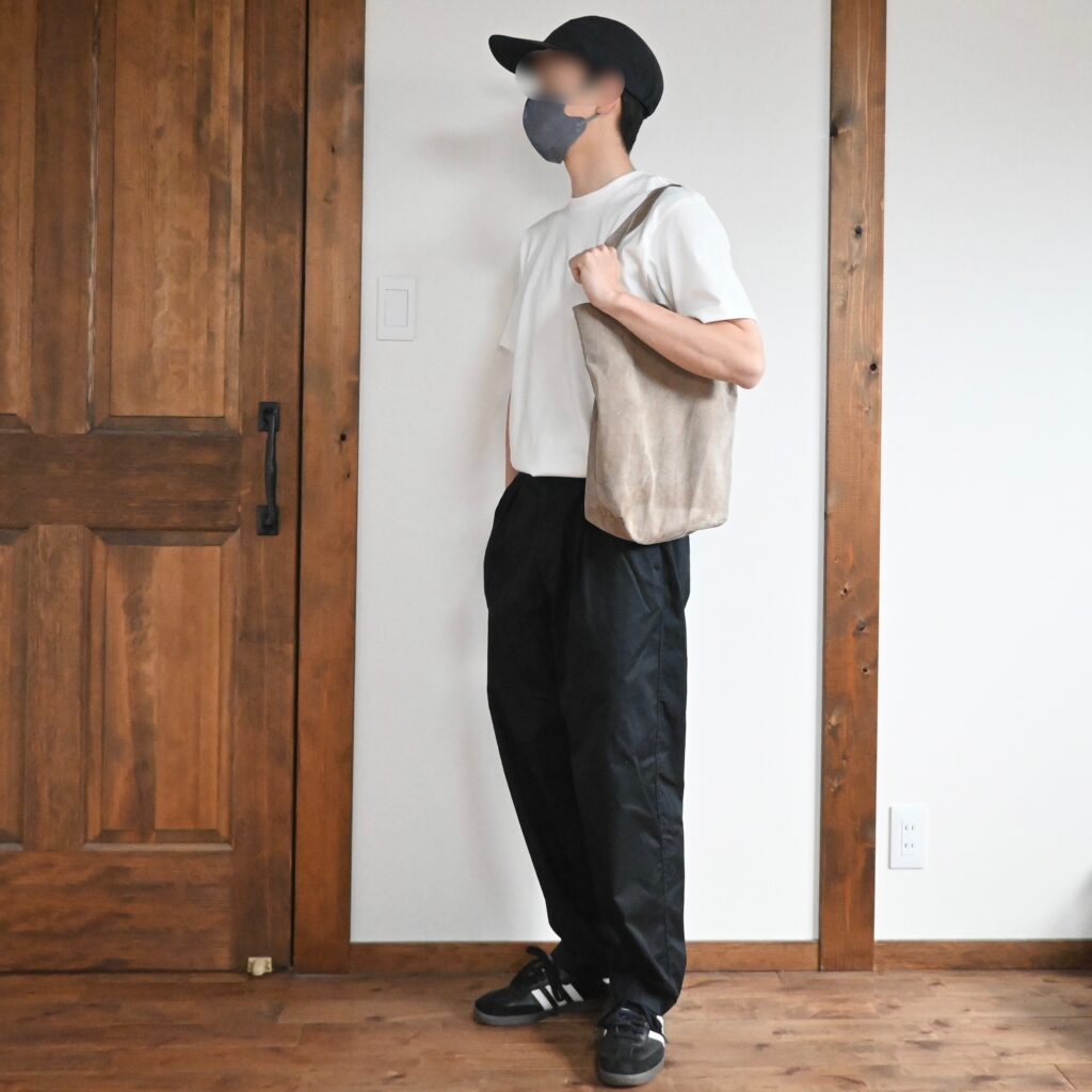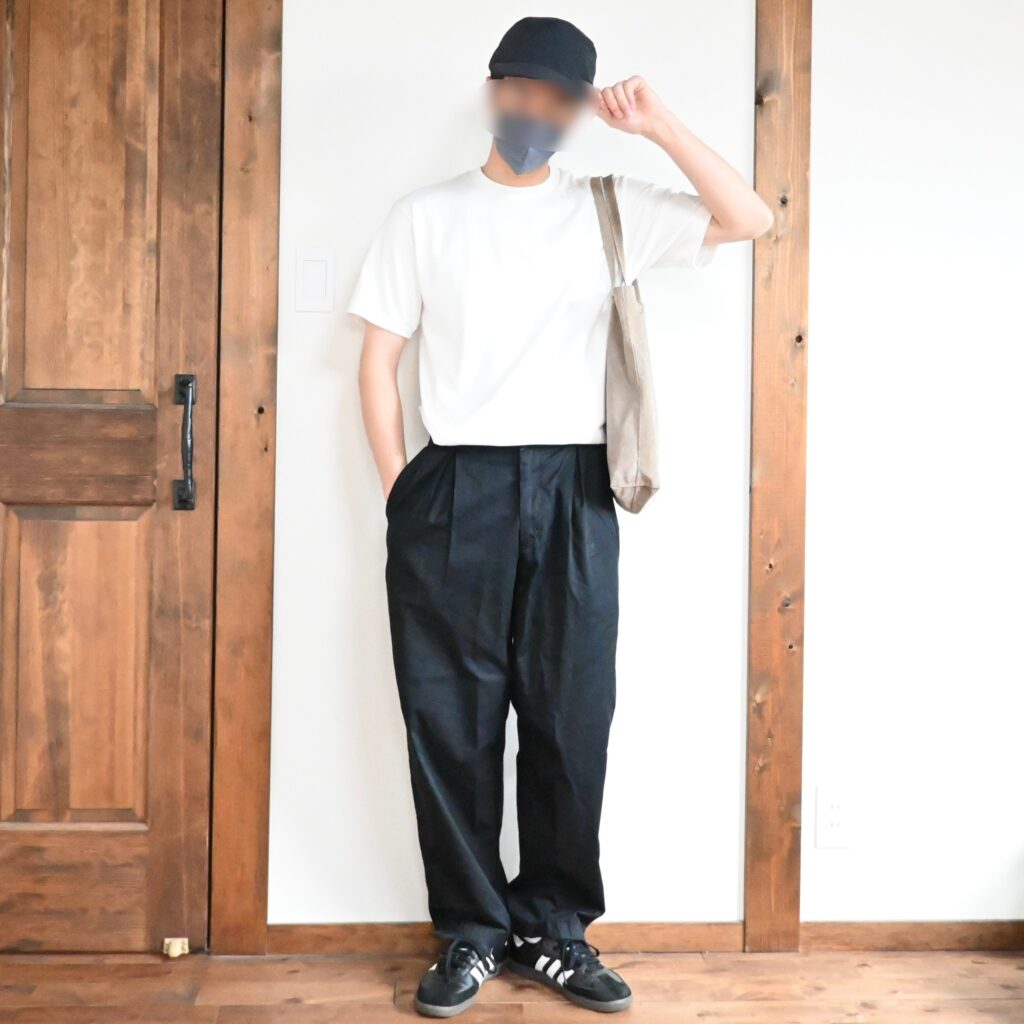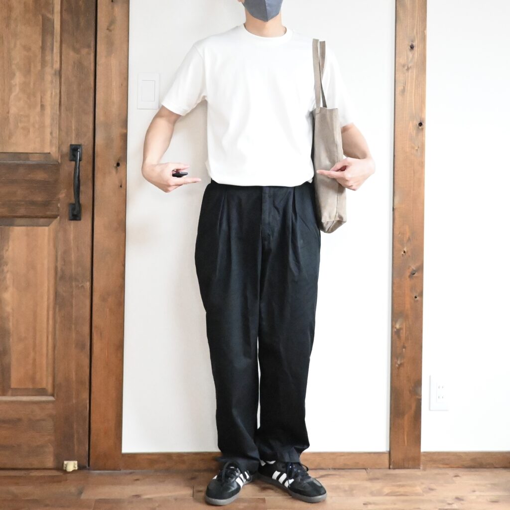 Mサイズでも着丈が長めなデザインなので、タックインした方がバランスが良いような気がしました。タックインして着る場合は黒パン(スラックスやチノパンなど)でシンプルにまとめるのが一番だと思います。今回は着けるのを忘れていたんですが、タックインする際には腕時計やバングルといった装飾品を足してあげると、より似合いやすいと思います。