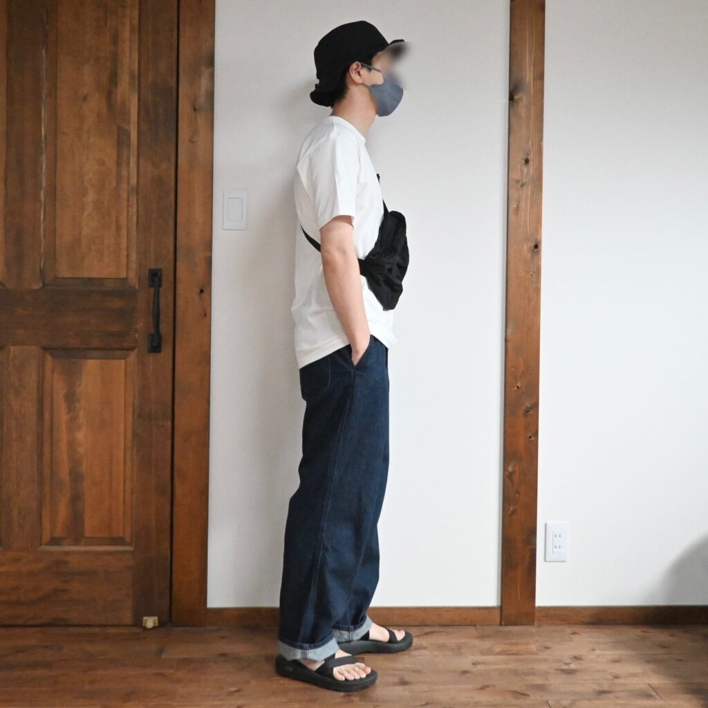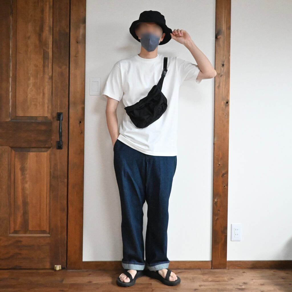 白Tにジーンズ、そしてサンダルという夏のカジュアルコーデ。ジーンズは本格的なジーパンではなく、無印良品で購入したカポック素材のジーンズなので、軽くて通気性が良くて夏でも履けそうです。