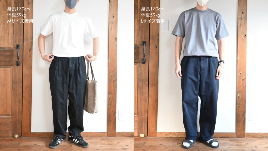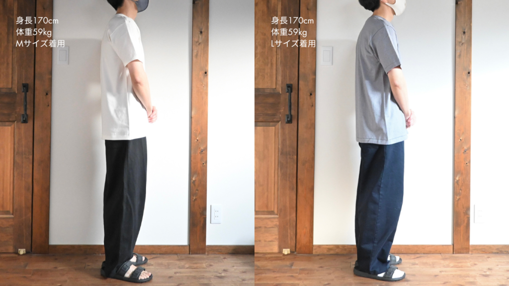Mサイズであればタックアウトして着ても問題なさそうですが、Lサイズだと着丈がかなり長くなるのでサイズUPするならタックインして着ないと厳しいかなと感じました。