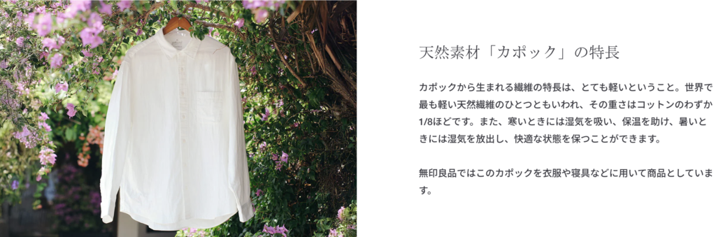 無印良品ではもはやお馴染みの天然素材で、僕もこれまで何点かカポック素材のアイテムを購入しているんですが、肌触りや着心地が良くて何より軽いというのが凄く好印象です。