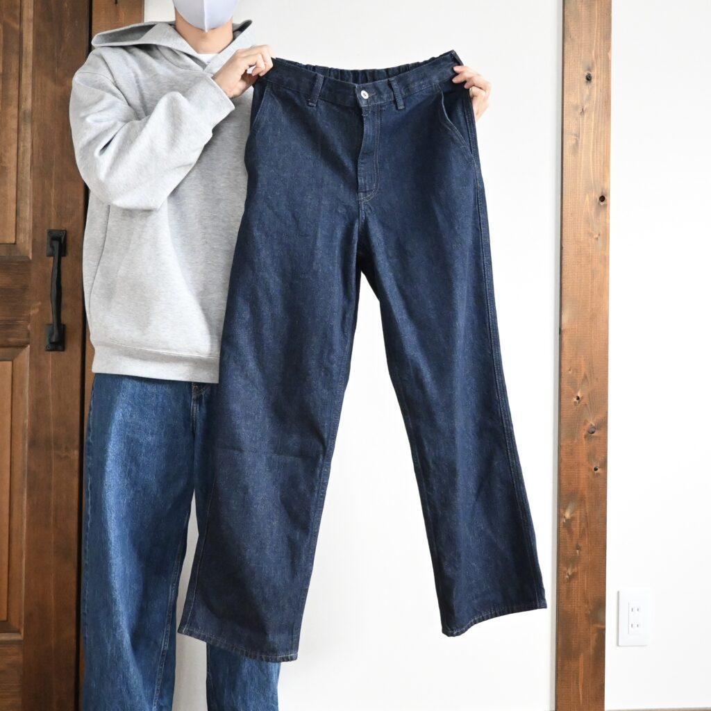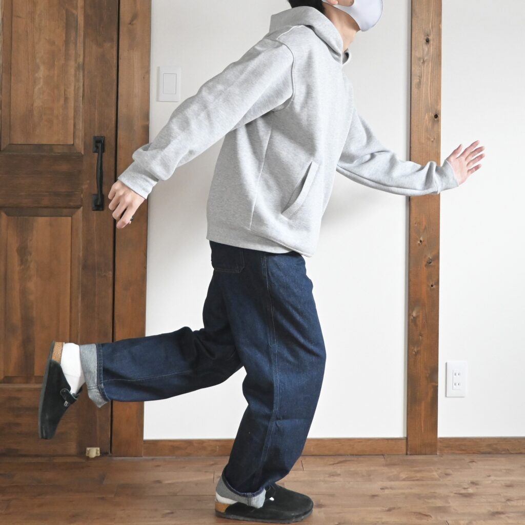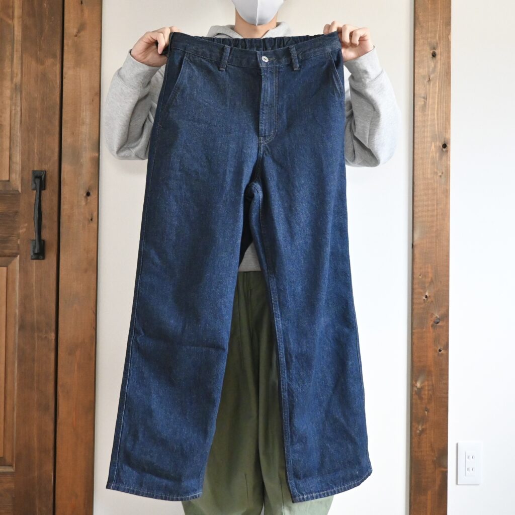太過ぎない程よいワイドシルエットなので、スウェットのようなカジュアルなアイテムと合わせてもバランス良く着れそうだったので、寒い今の時期から使いやすいように感じました。僕のように小さいお子様がいるお父さんには、カチカチのジーパンよりも軽くて動きやすいこちらのデニムパンツの方が使いやすいのでは?と感じました。