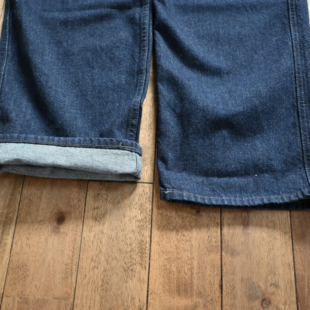 股上も深めでワタリ幅も広いので、無印良品のパンツにしては結構ワイドシルエットだなと感じました。股下が74cmと少し長めだったんですが、僕の場合ジーパンを履く時は基本的に1回折ってから履きたいので、折り返して履くとちょうど良い長さでした。
