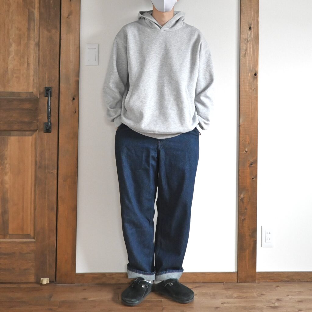 パーカーにジーパンは流石に野暮ったくなりそうだな…と思ったんですが、それぞれのサイズ感なのか素材感なのか、意外とおじさん感が出ずにまとまったかなと思いました。