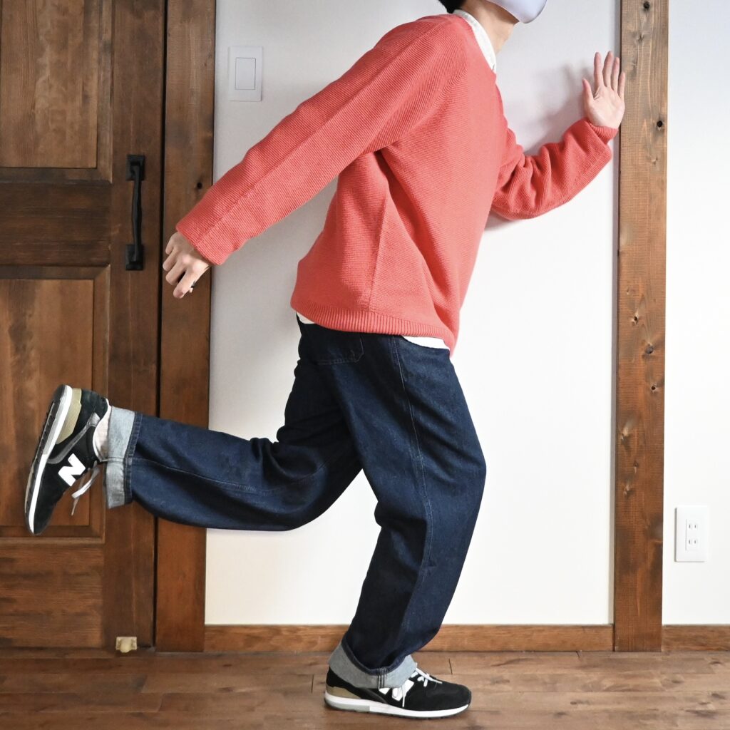 履いた感じも程よくワイドシルエットなので、ニットやスウェット、Tシャツといったカジュアルなアイテムと相性が良いので、普段使いしやすいパンツだと感じました。
