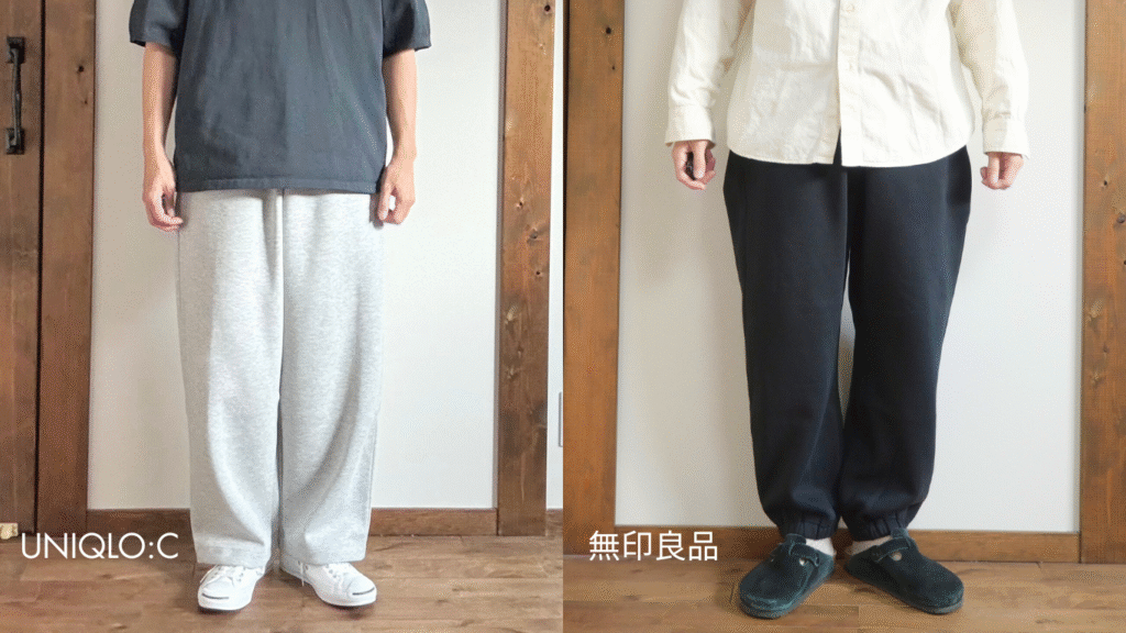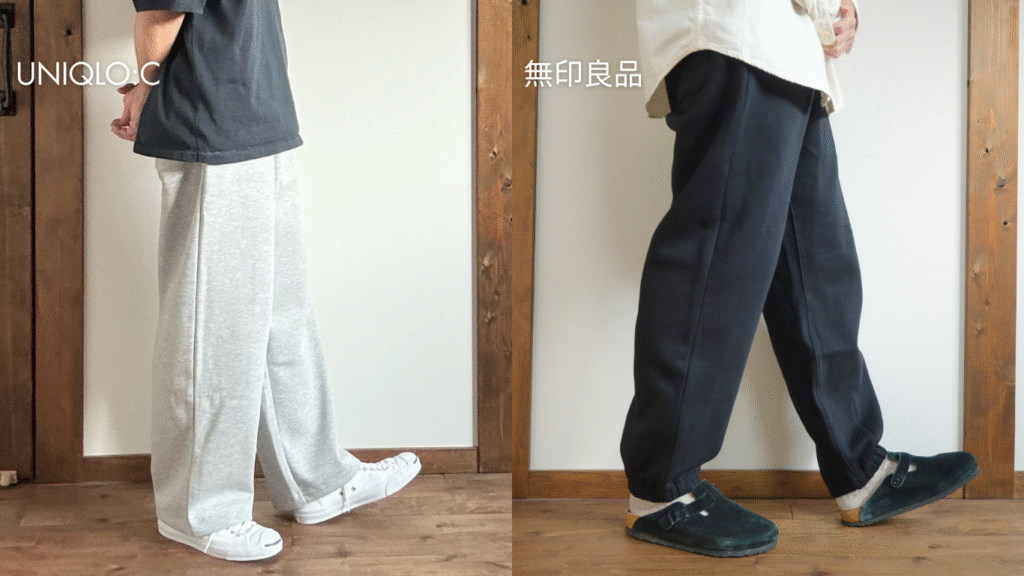 UNIQLO:Cはワイドストレートスウェットパンツ、無印良品の方は裾が絞られたワイドシルエットのスウェットパンツ。