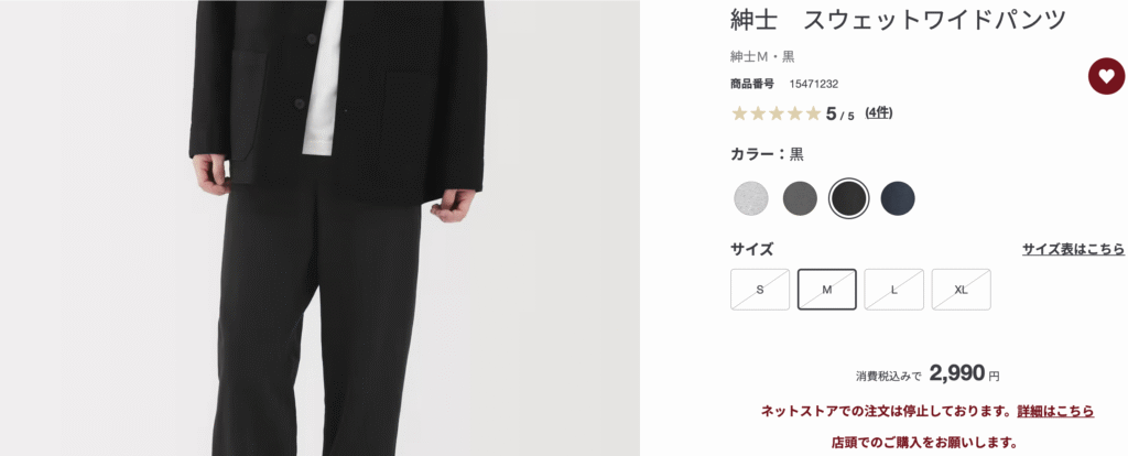 もちろんファッションは自由だし、何歳になってもワイドパンツは履けると思うんですが、「今から数年経ってどっちのパンツを使っていたい?」と問われると、僕だったら無印良品のスウェットワイドパンツかなと思います。