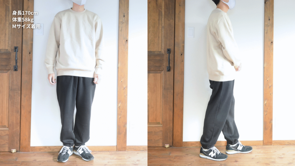 身長170cm体重58kgの僕は、Mサイズを選びました。無印良品のスウェットワイドパンツは、UNIQLO:Cのようにドーンとワイドシルエットという程ではなく、比較的ワイド感抑えめな印象でした。