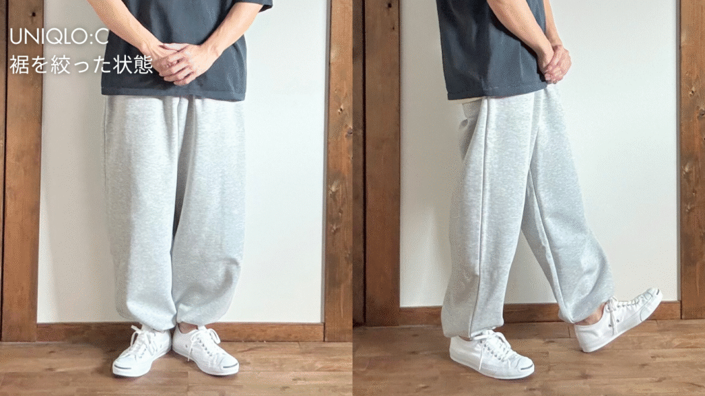 程よくゆったりとしたシルエットで裾が絞られているので、アウトドア寄りの動きやすい服装と相性が良さそうでした。逆にUNIQLO:Cのスウェットワイドパンツは、もっと若者向けなタウンユースなコーデが多くなるかなと思います。
