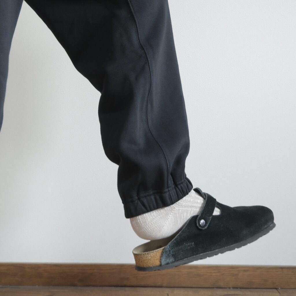 足元はビルケンシュトックの『ボストン』というサンダルを合わせています。裾が絞られたデザインになっているので、こうしたサンダルや甲の低いスニーカーを合わせるとバランスが良いかなと思います。
