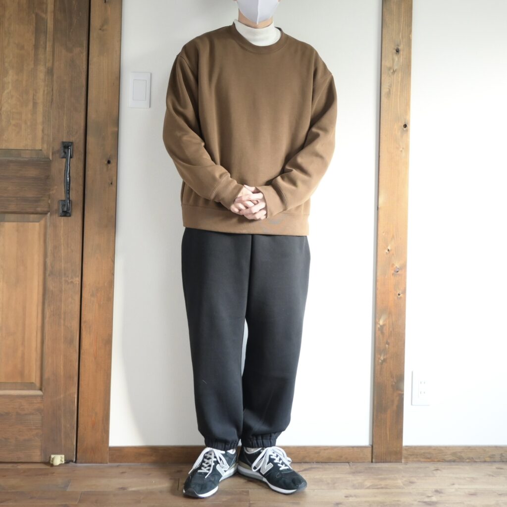 程よいワイドシルエットなので、スウェットやパーカーのようなカジュアルなトップスとの相性はバッチリですし、シャツやハイネックTのような綺麗めなアイテムと合わせた時にもバランスが良く、コーデの幅が非常に広いなと感じました。なので、余計に裏起毛ではないタイプも今後発売して欲しいなと思います。