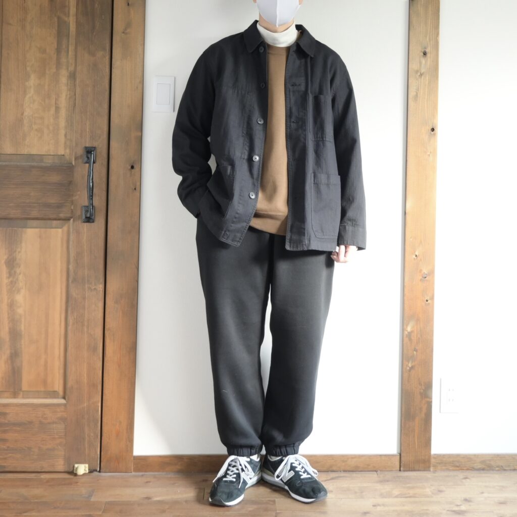 アウターは無印良品のカバーオール。上下ブラックで内側にブラウンを足したカジュアルなコーデになります。上下スウェットの割にはバランスが取れてるんじゃない?と感じたんですが、UNIQLO:Cのスウェットシャツが光沢感のある生地で丈が短めだからなのか、スウェットワイドパンツの裾丈がちょどいい長さだからなのかは分かりませんが、上下スウェットでも全然部屋着っぽさは無いなと感じました。