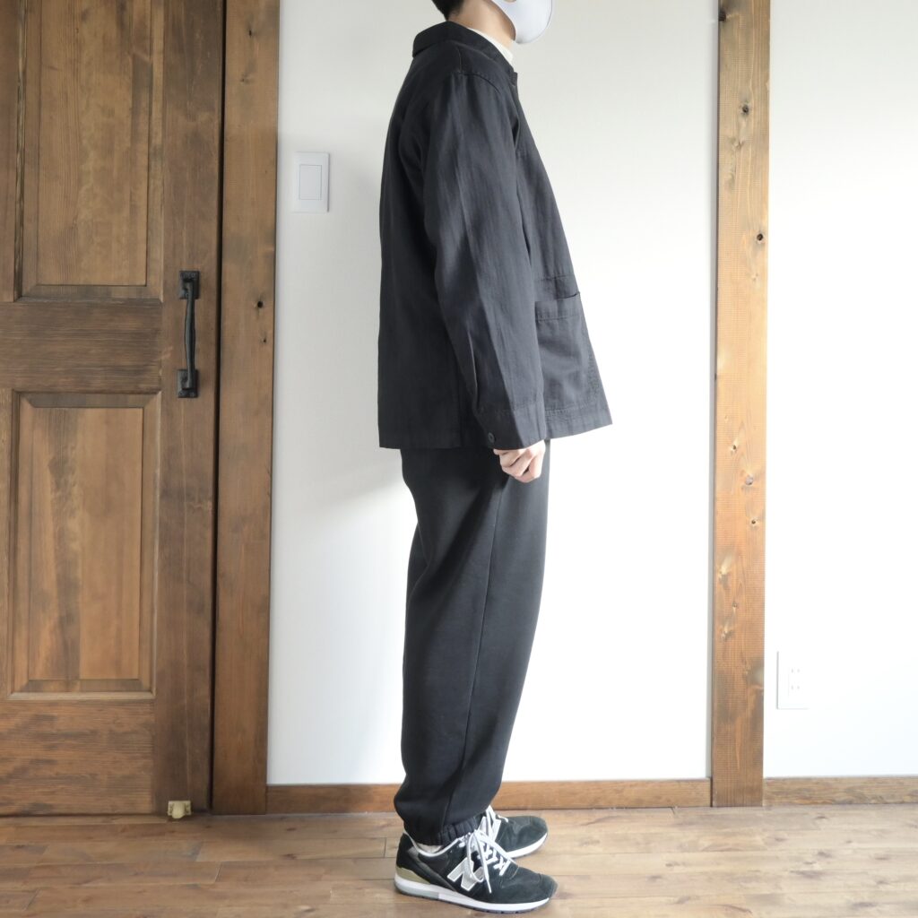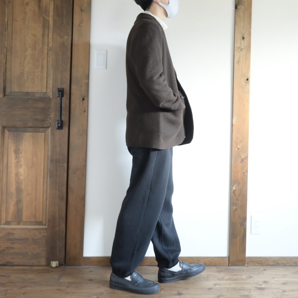 ジャケットだとパンツはスラックスというイメージですが、普段着として着るとちょっと固いかな…と思うので、もっとラフにジャケットコーデをしたいときにスウェットパンツは意外と役立ちます。UNIQLO:Cのスウェットワイドパンツだと流石に太過ぎて会わないんですが、無印良品の方だとこうしたジャケットコーデでも違和感少なく合わせやすいと思います。