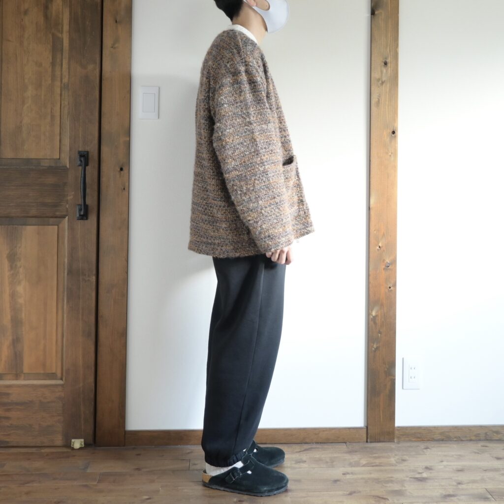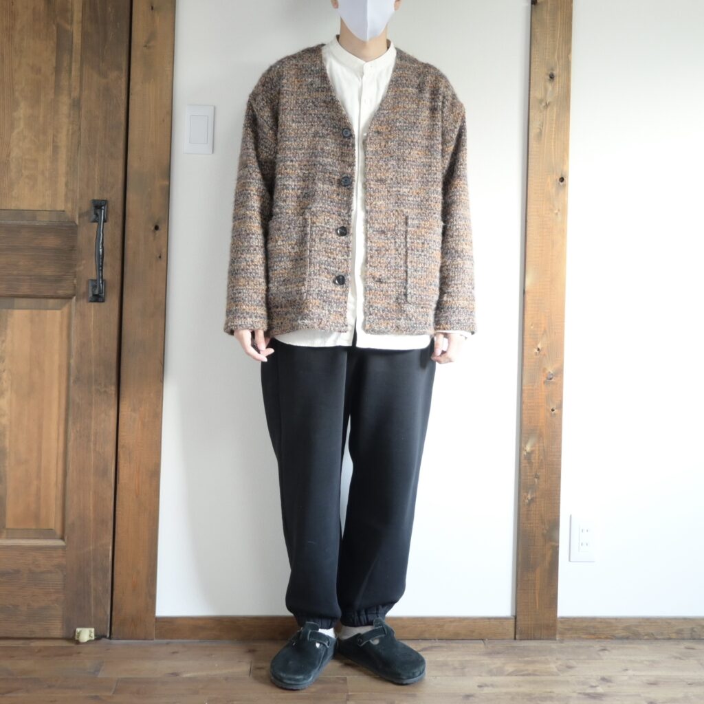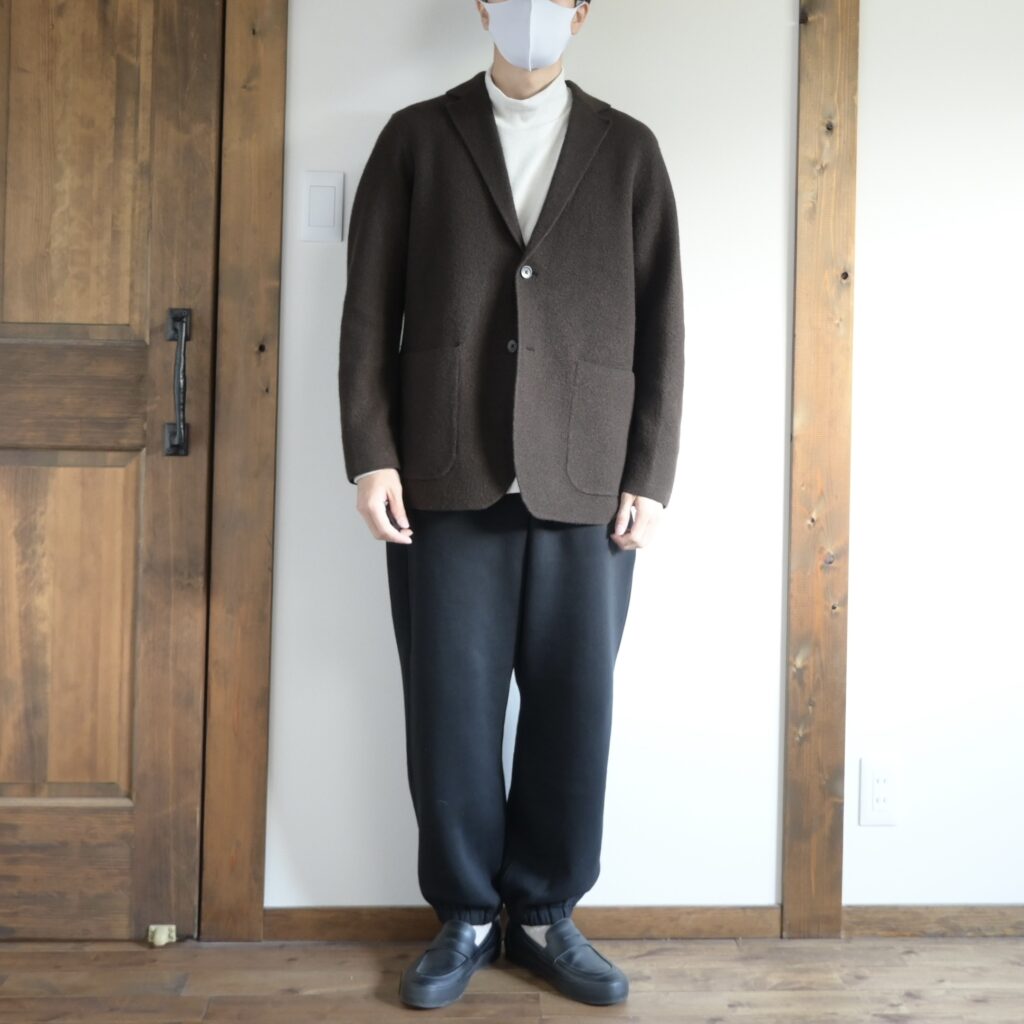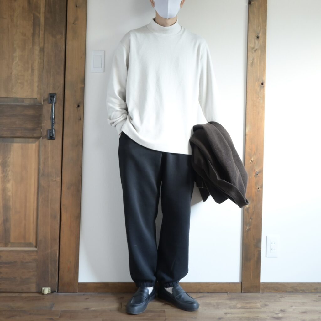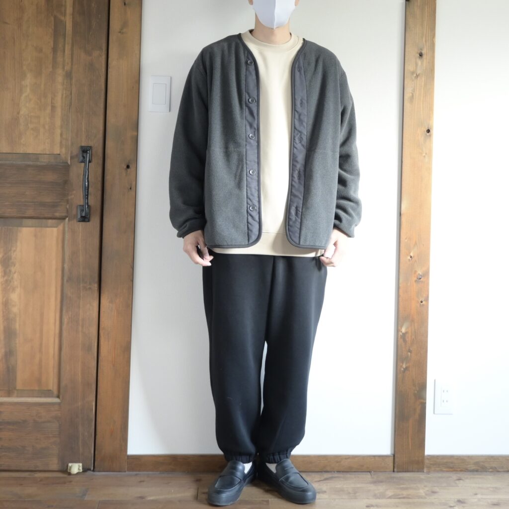 UNIQLO:CのニットジャケットにモックネックのTシャツを合わせて、ちょっと落ち着いた雰囲気で合わせてみたんですが、スウェットパンツでもそんなに違和感なく合わせれたかなと思います。