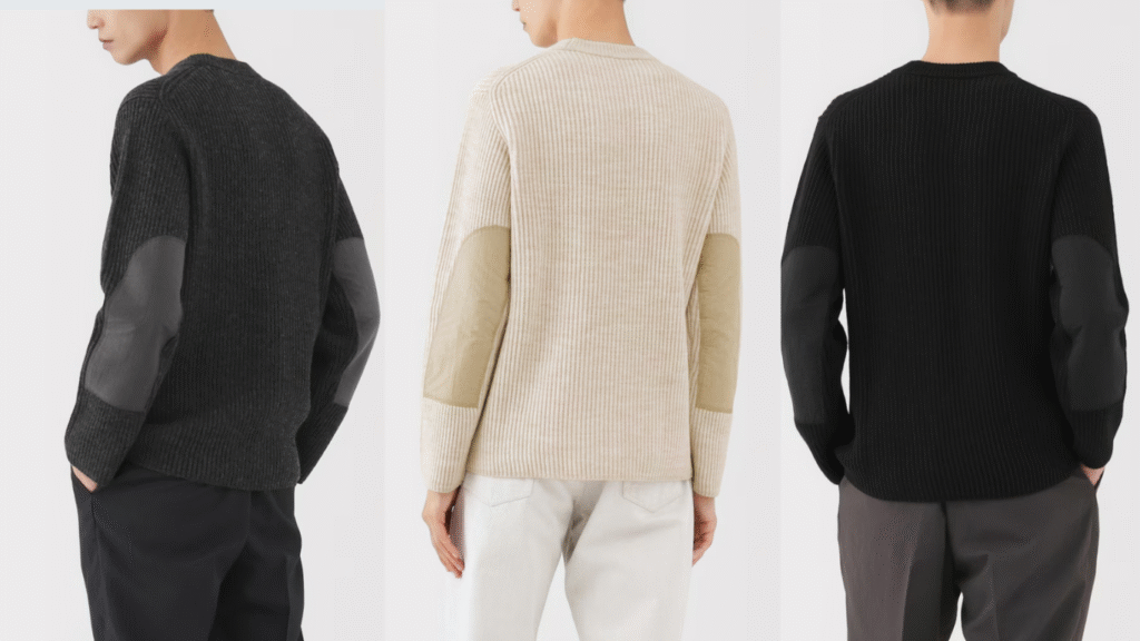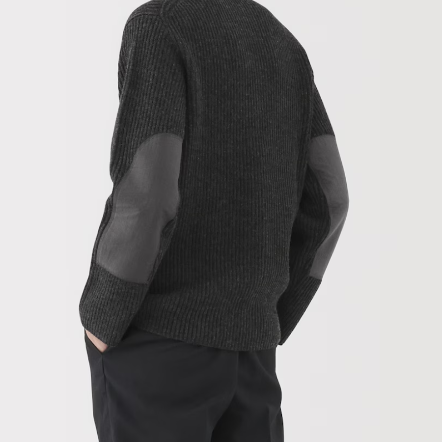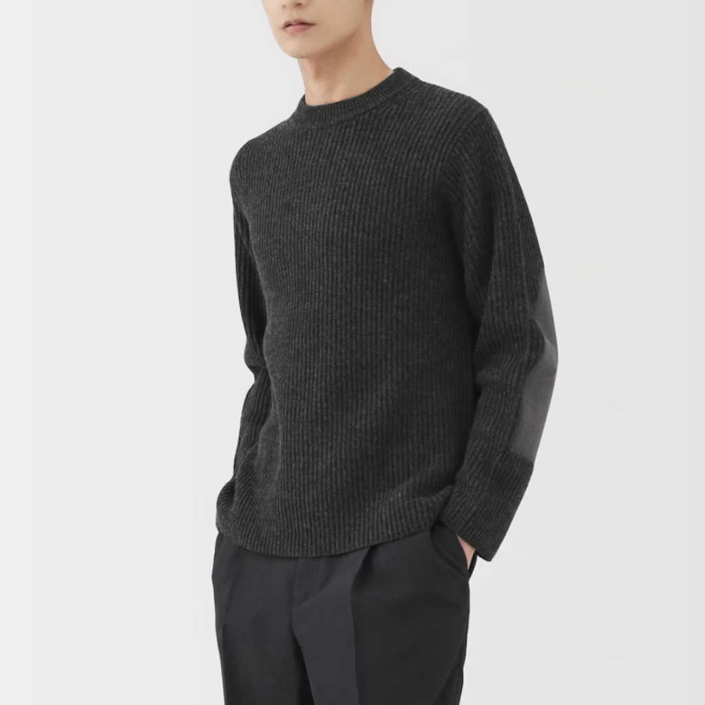 写真で見る限りはチャコールグレーかブラックが大人っぽくて良さそうに感じました。通常ラインの無印良品やUNIQLOなどではエルボーパッチ付きのニットなんてほとんど無いので、このデザインにピンと来たら要チェックだと思います。