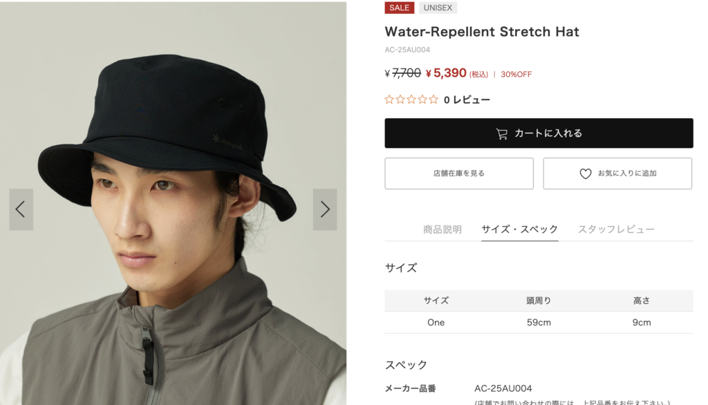 今回購入したのは、アウトドアブランドとして有名なsnow peakの『Water-Repellent Stretch Hat』という全面にツバが付いているバケットハットとサファリハットの中間のようなデザインの帽子になります。