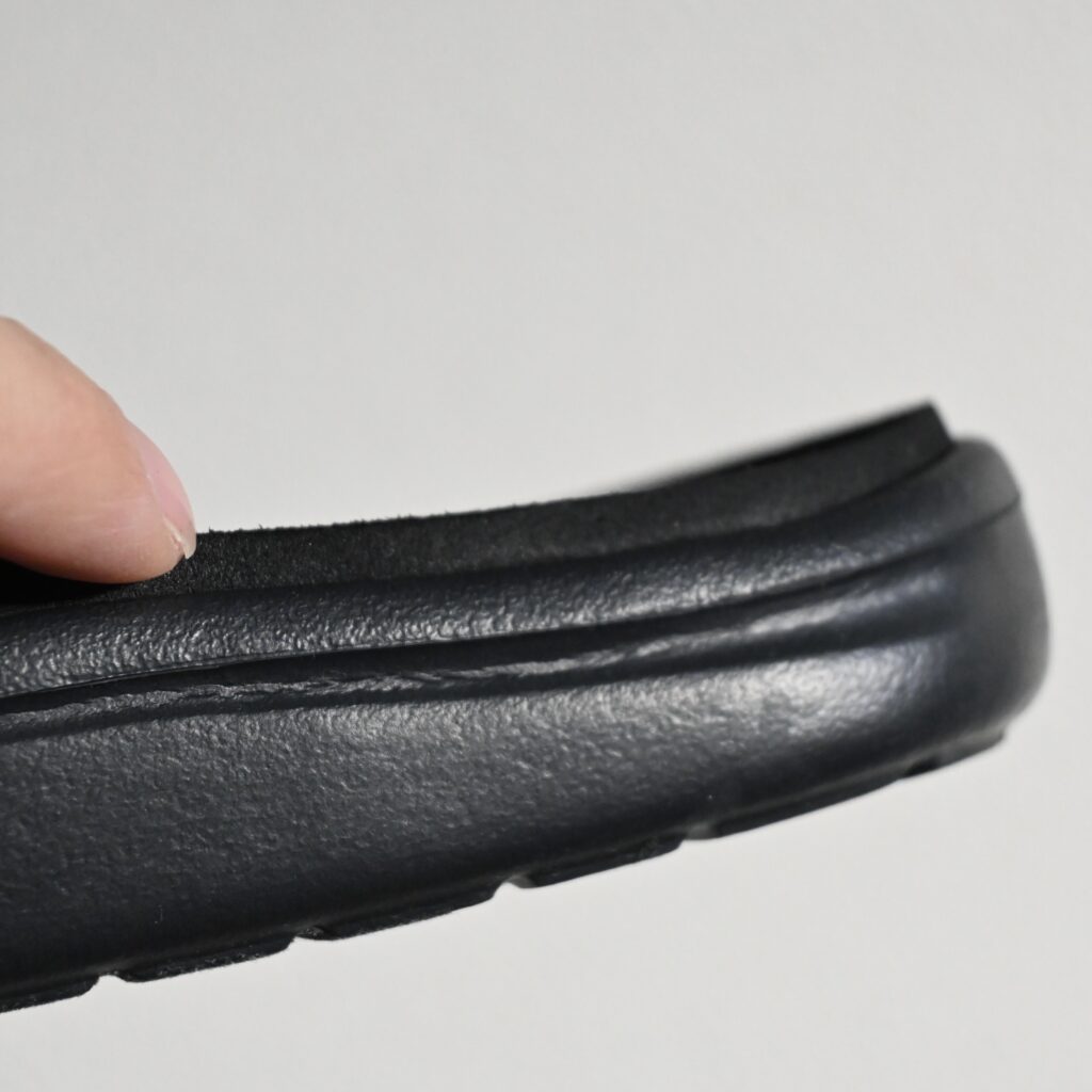 指で押し込むと少し沈み込むような柔らかい素材なんですが、いざ水に濡れると水を吸収してしまうのでなかなか乾いてくれません。試しに霧吹きを使って表面をかなり濡らして、その後タオルで拭き取って放置してみたんですが、トップソールが水を吸収してしまうせいか1時間経ってもソールは湿ったままでした。