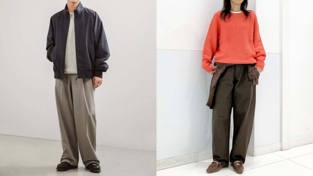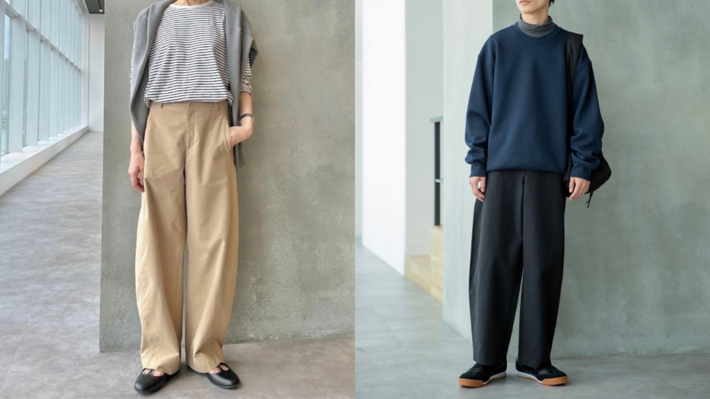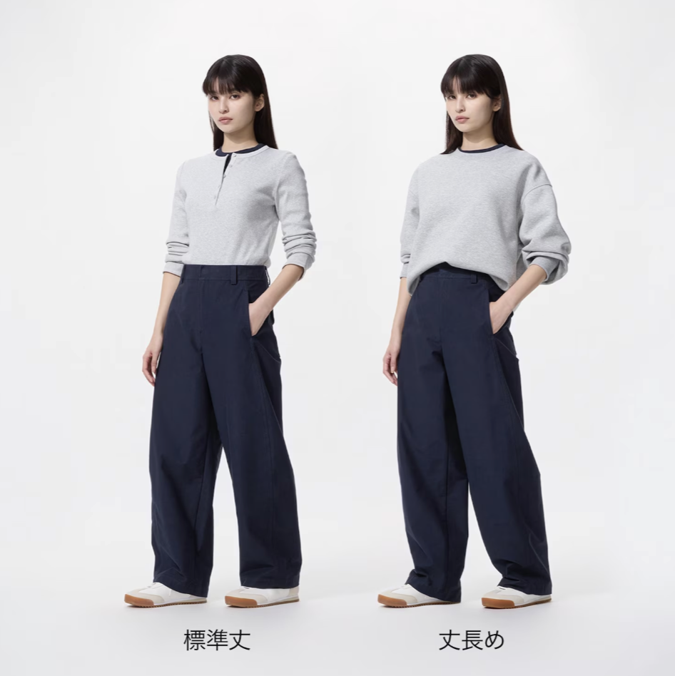 左側は女性、右側は男性が着用されています。男女問わずシルエットが凄く綺麗で使いやすそうです。ここ最近UNIQLOから出るワイドパンツは本当にシルエットが綺麗でクオリティーが高いと思います。