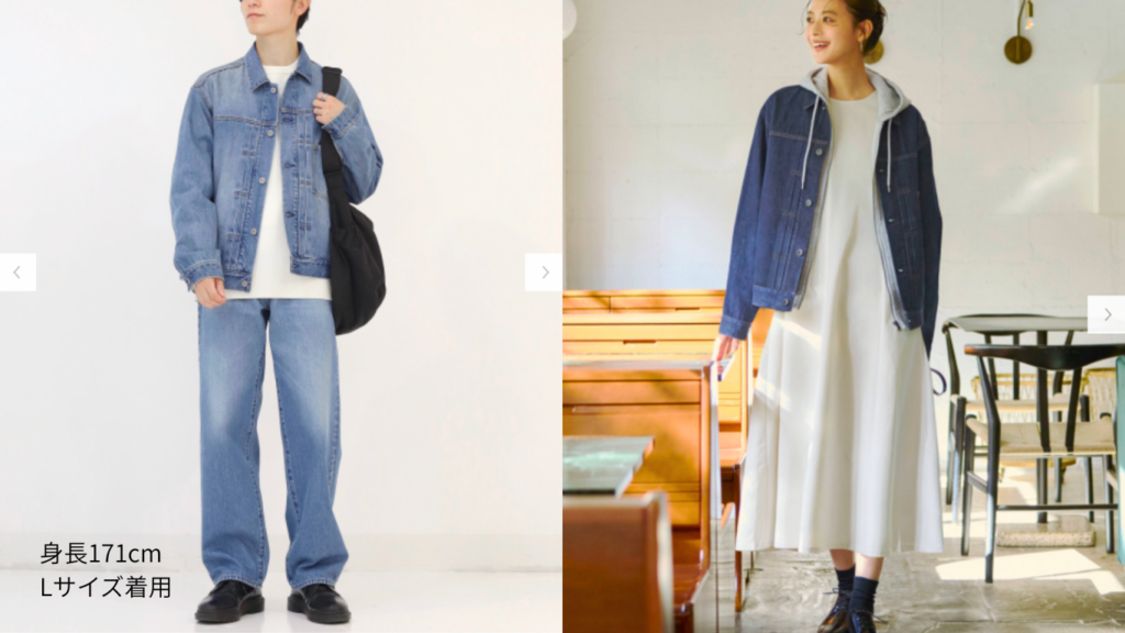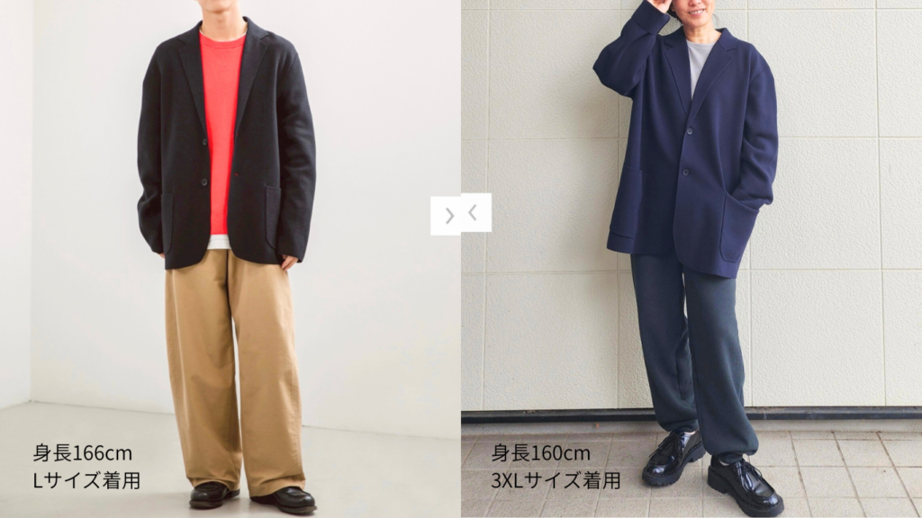 かっちりとしたジャケットというよりは、カジュアルなカーディガン感覚で使えそうなのが良いなと思いました。身長185cmのモデルさんがXLサイズを着ている写真を見ると、ゆるっとリラックス感があって格好良いなと感じました。