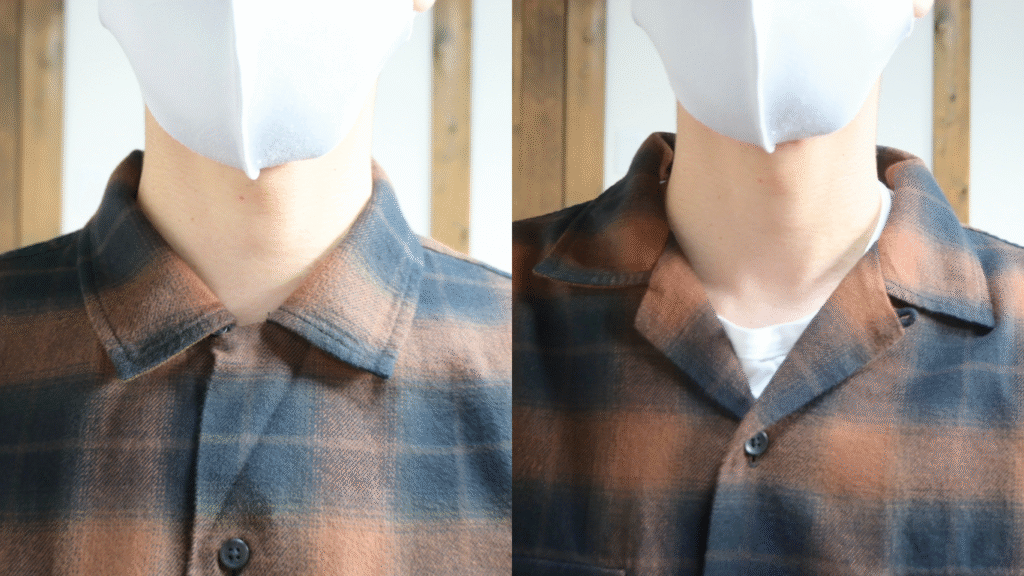 こちらのシャツは一番上のボタンを閉めることでレギュラーカラーシャツのように使うことも出来るんですが、一番上のボタンがとにかく閉めにくいし、めちゃめちゃ開けにくい。指が細い僕でもかなり苦戦したので、開け閉めするのに苦戦する方も多いのではないでしょうか。