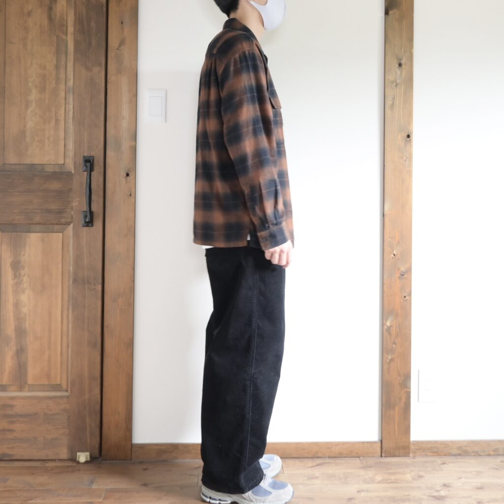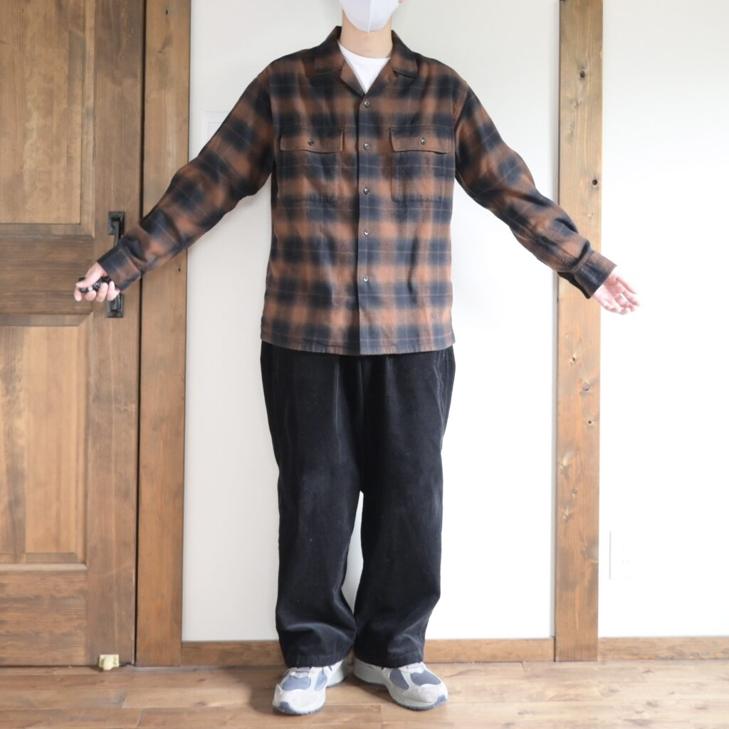ただ、やはり着丈が短いのでワイドパンツを合わせた時にバランスが…と感じました。いつも着丈が長めなシャツを着ることが多いので着丈の短さはやや違和感を感じます。Lサイズでも袖の長さはそれほど感じなかったので、Lでも良かったかな?とも思いますが、どっちを選んでも何か後悔は生まれそう。