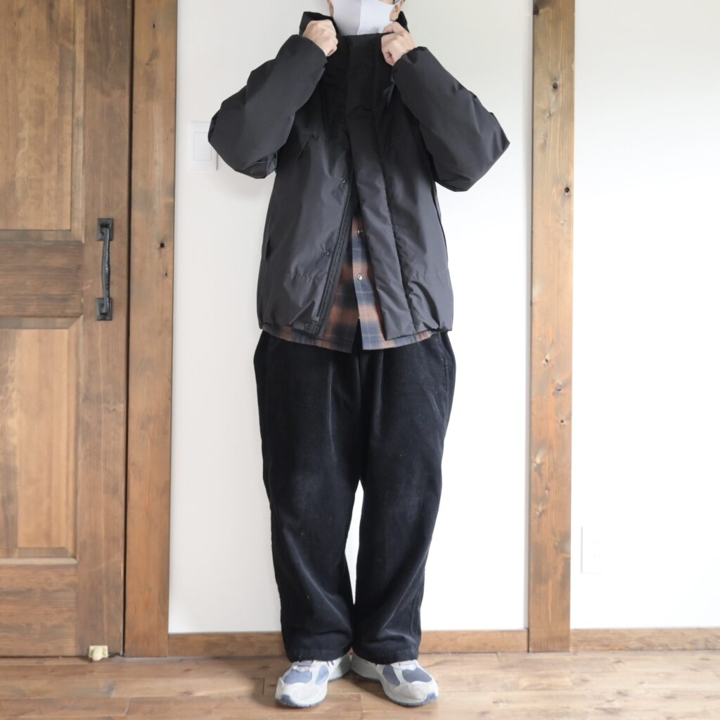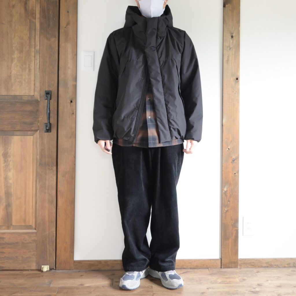 続いては首周りが隠れるようなデザインのアウター(中わたアウターや防風素材のものが多いですね)に合わせてみました。