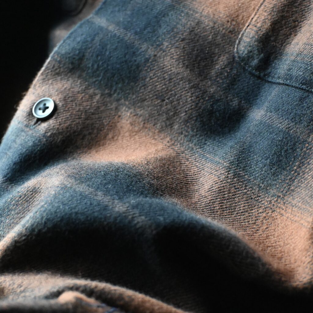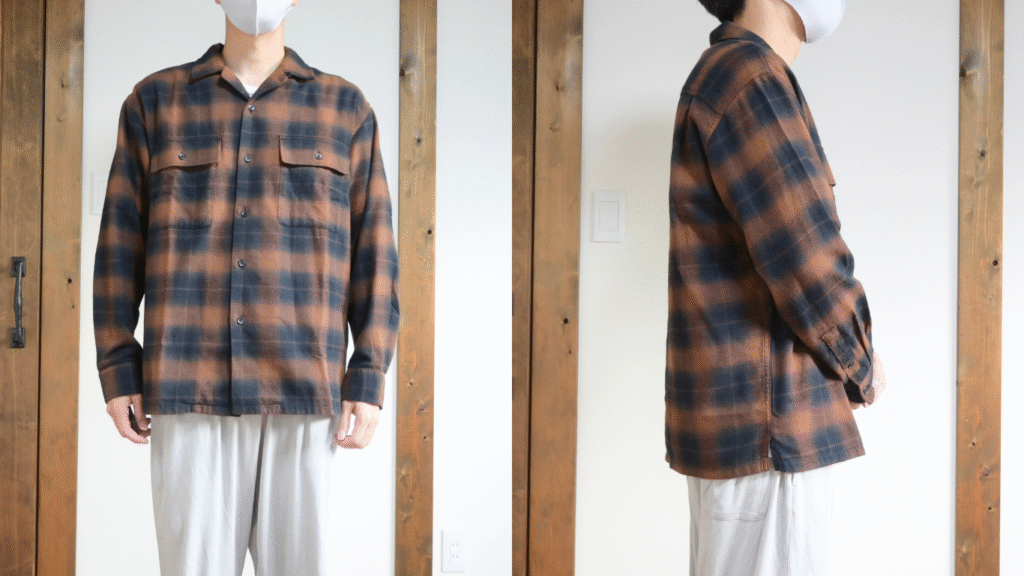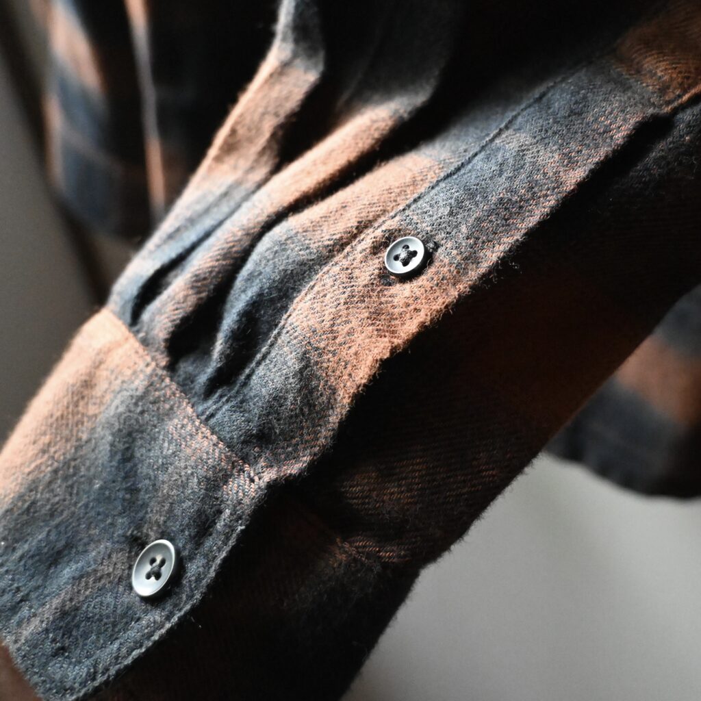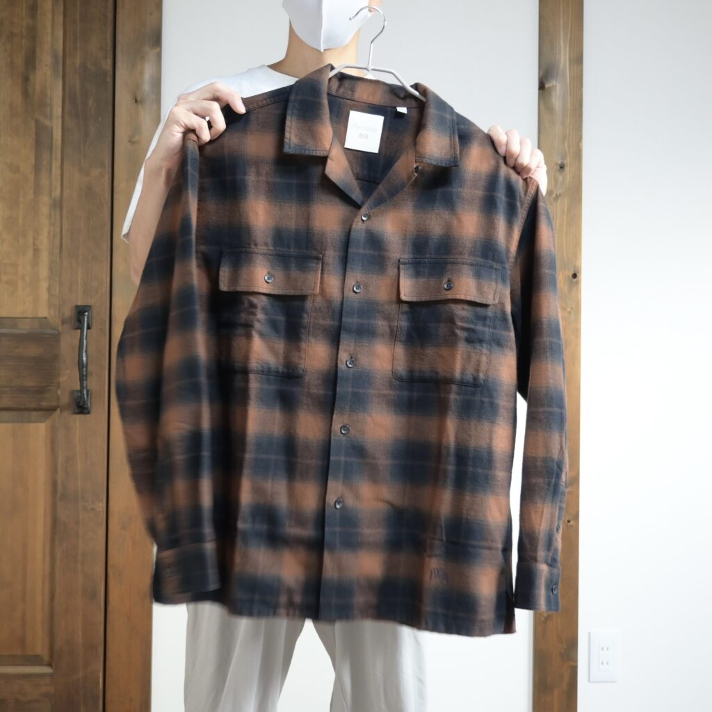 素材はコットン100%で起毛感のある秋冬に適した生地でした。”ブラッシュド”と商品名に入っていますが、生地としてはネルシャツです。そこまで厚手ではないので、今の時期に1枚で着ても良いですし季節が進んで冬になると、インナーとして使うのも良さそうですね。