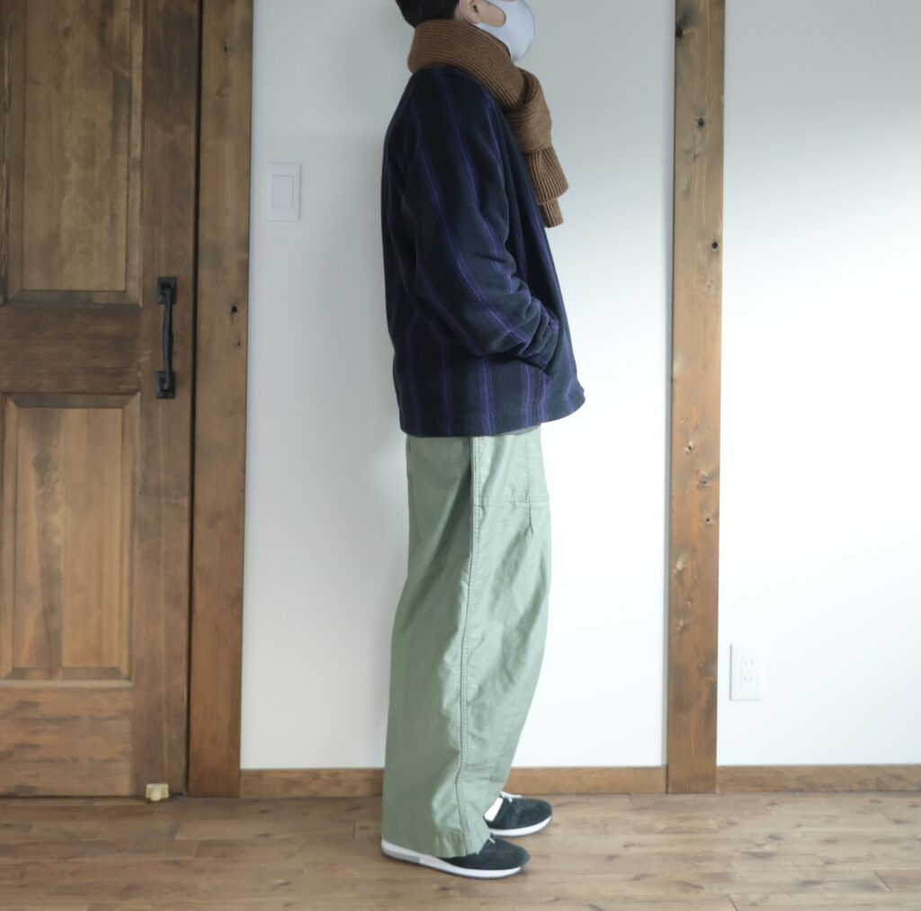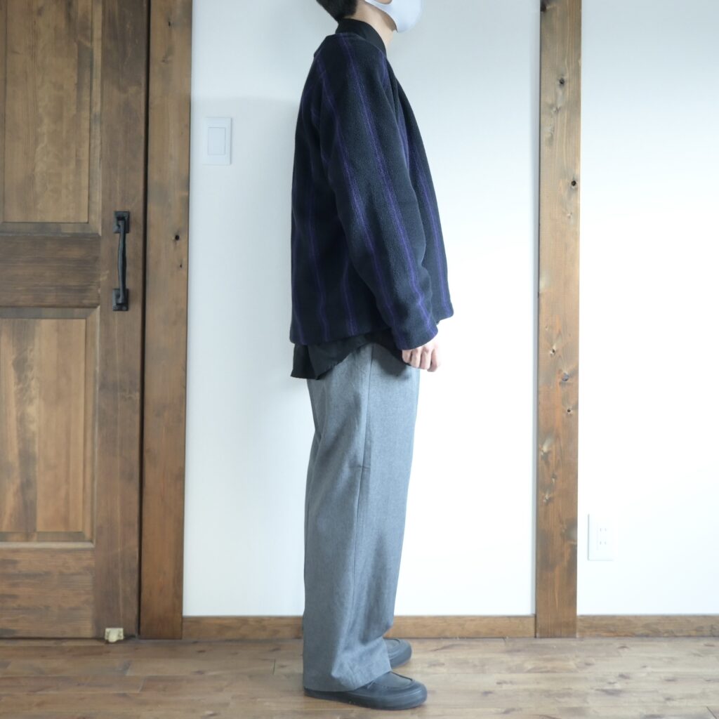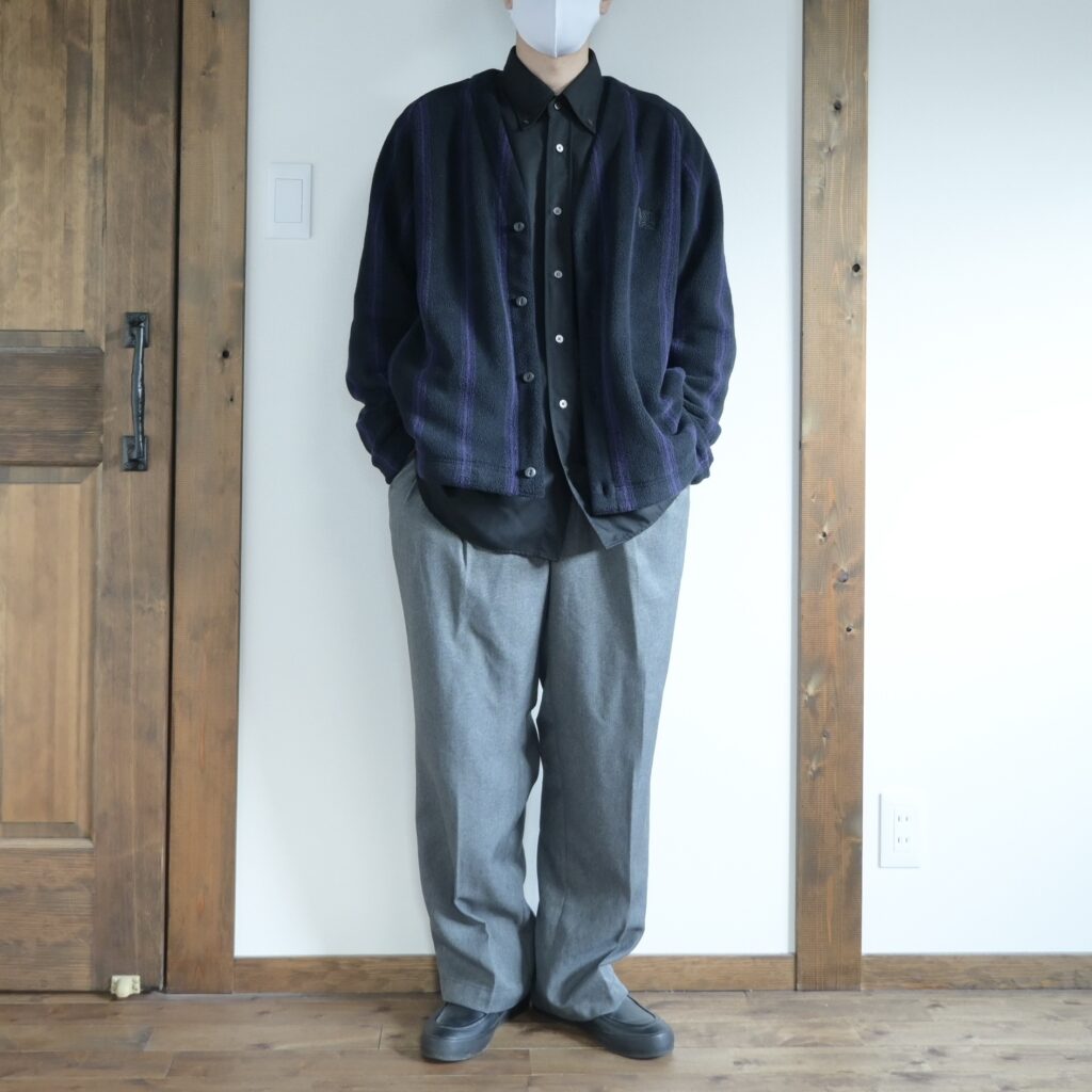 中に着たシャツは昨年のUNIQLO Uで購入した『ドレープシャツ』パンツはワークマンカラーズの『ツータックバギーパンツ』どちらもオーバーサイズながらも綺麗めなアイテムなので、「フリースのカーディガンって会うのかな?」と不安に感じましたが、意外に大丈夫そうです。