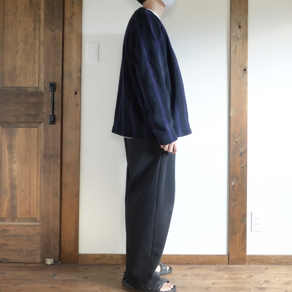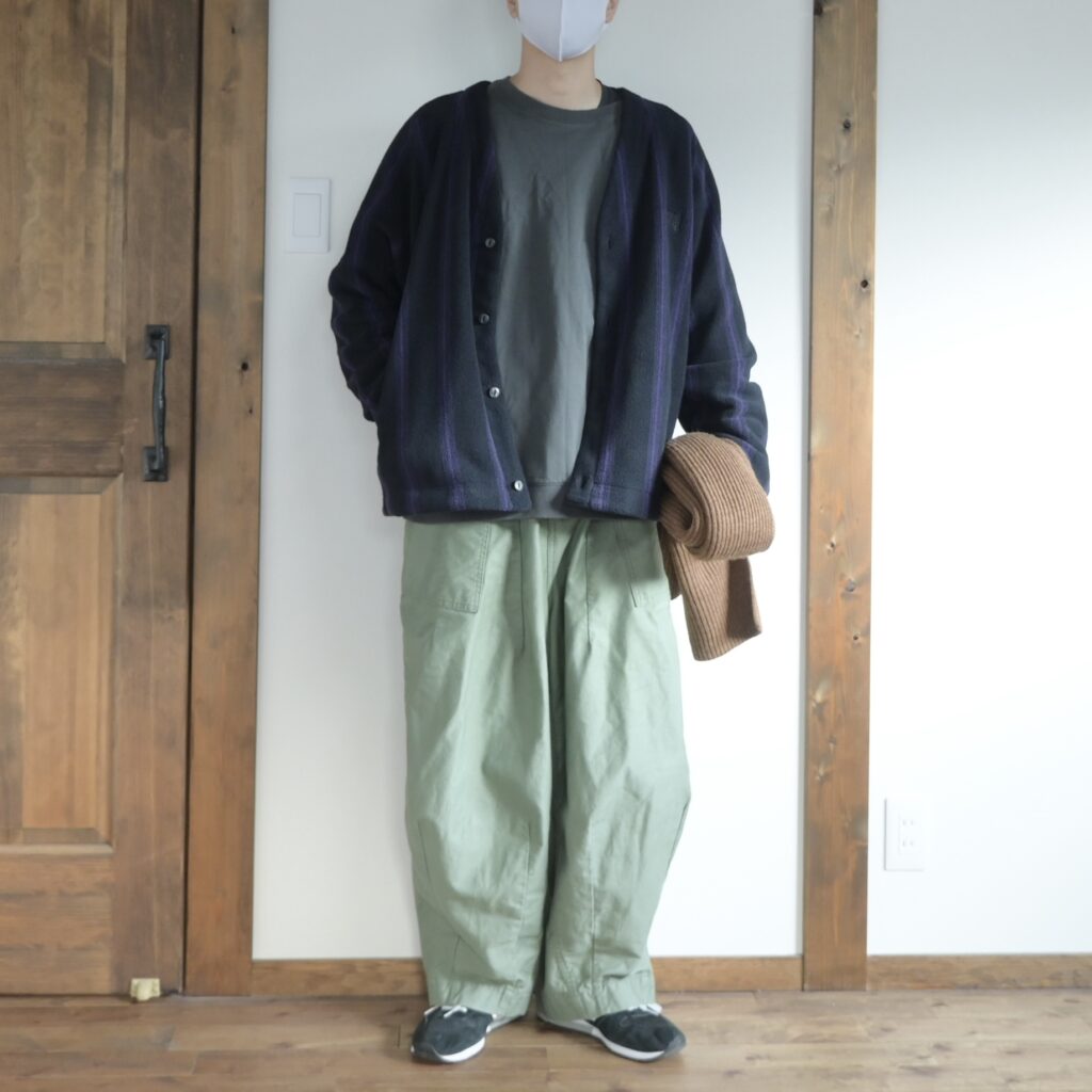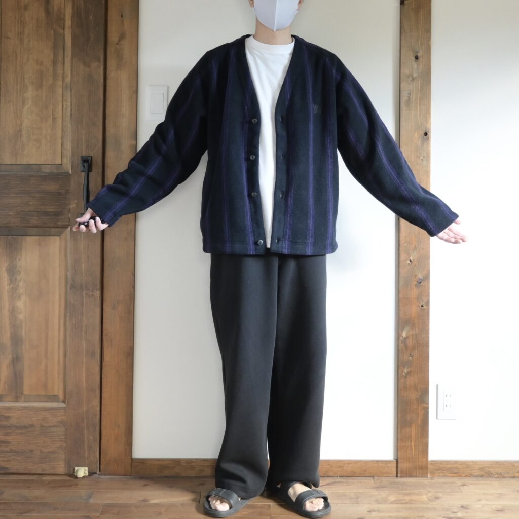 中に着たシャツは昨年のUNIQLO Uで購入した『ドレープシャツ』パンツはワークマンカラーズの『ツータックバギーパンツ』どちらもオーバーサイズながらも綺麗めなアイテムなので、「フリースのカーディガンって会うのかな?」と不安に感じましたが、意外に大丈夫そうです。