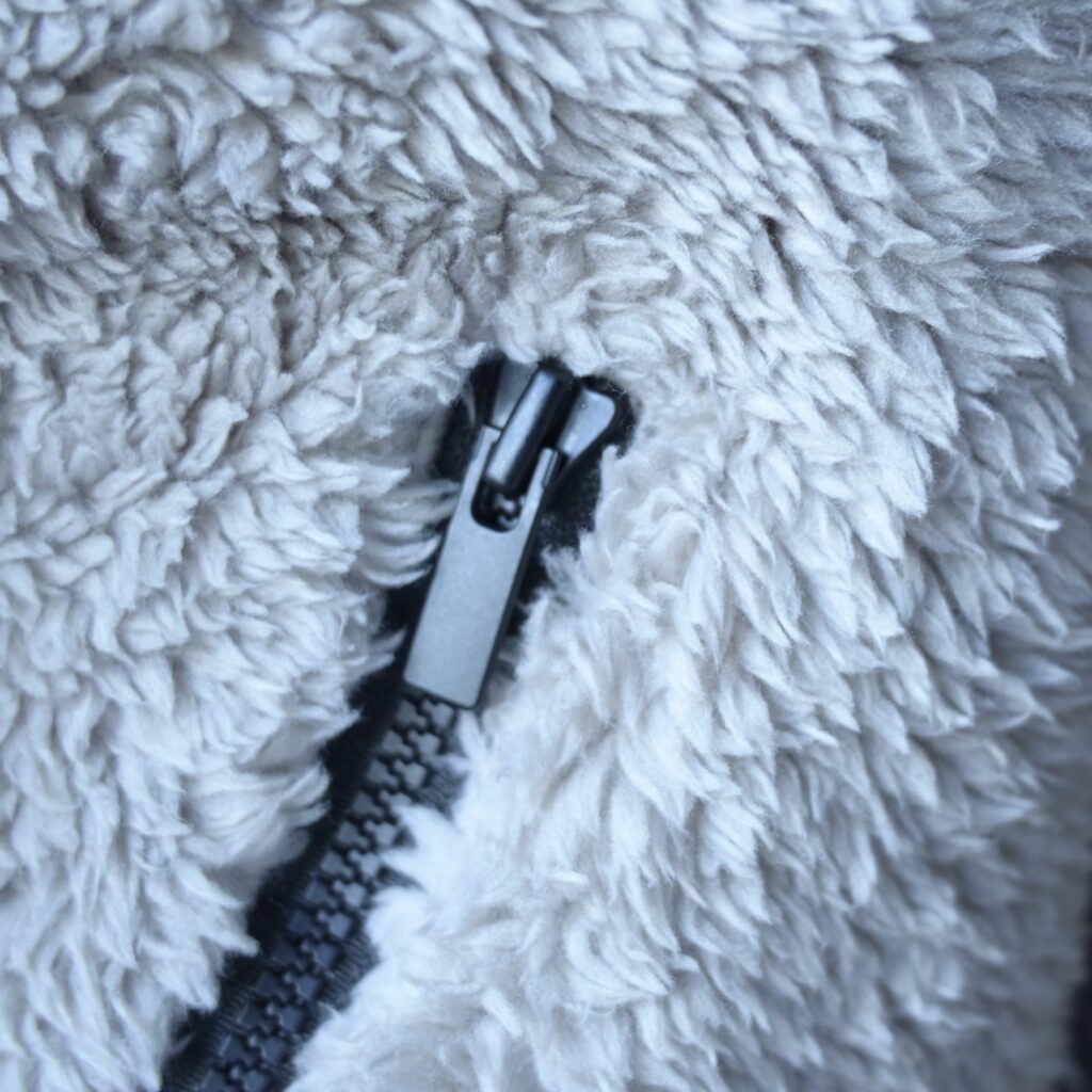 防風フィルムなどは付いていないので、普通に風はガンガンに通します。真冬にアウターとして着るのは無理だと思いますが、この上にダウンを着たり下にインナーダウンを入れるなど対策することで使えそうです。襟が高めなデザインなので、首元までしっかり暖かいです。