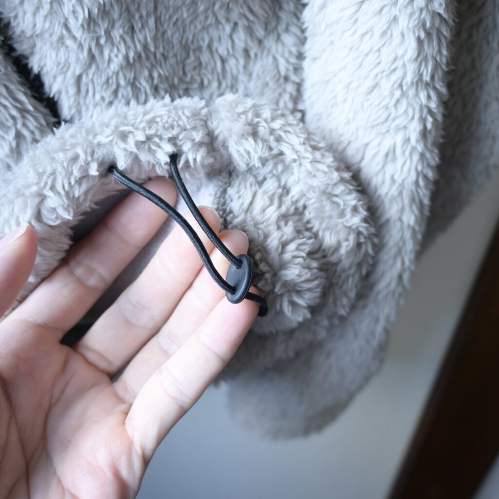 裾を絞ってシルエットを変えることが出来ますが、実際にやってみるとそこまで変化を感じなかったのと、このフリースジャケットは大きめにダボっと着る方が可愛いなと思ったので、個人的にはあまり使わないかな?と感じました。