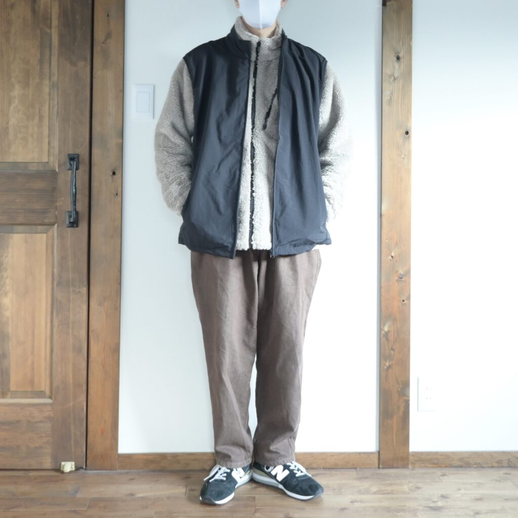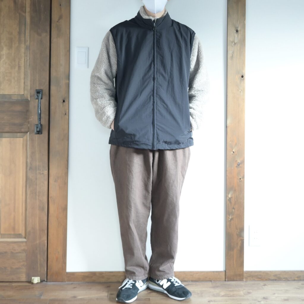 まずはフリースジャケットの上に最近ワークマンで購入したナイロンベストを合わせてコーデしてみました。