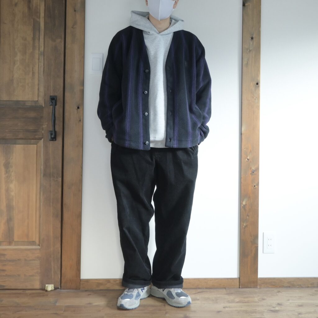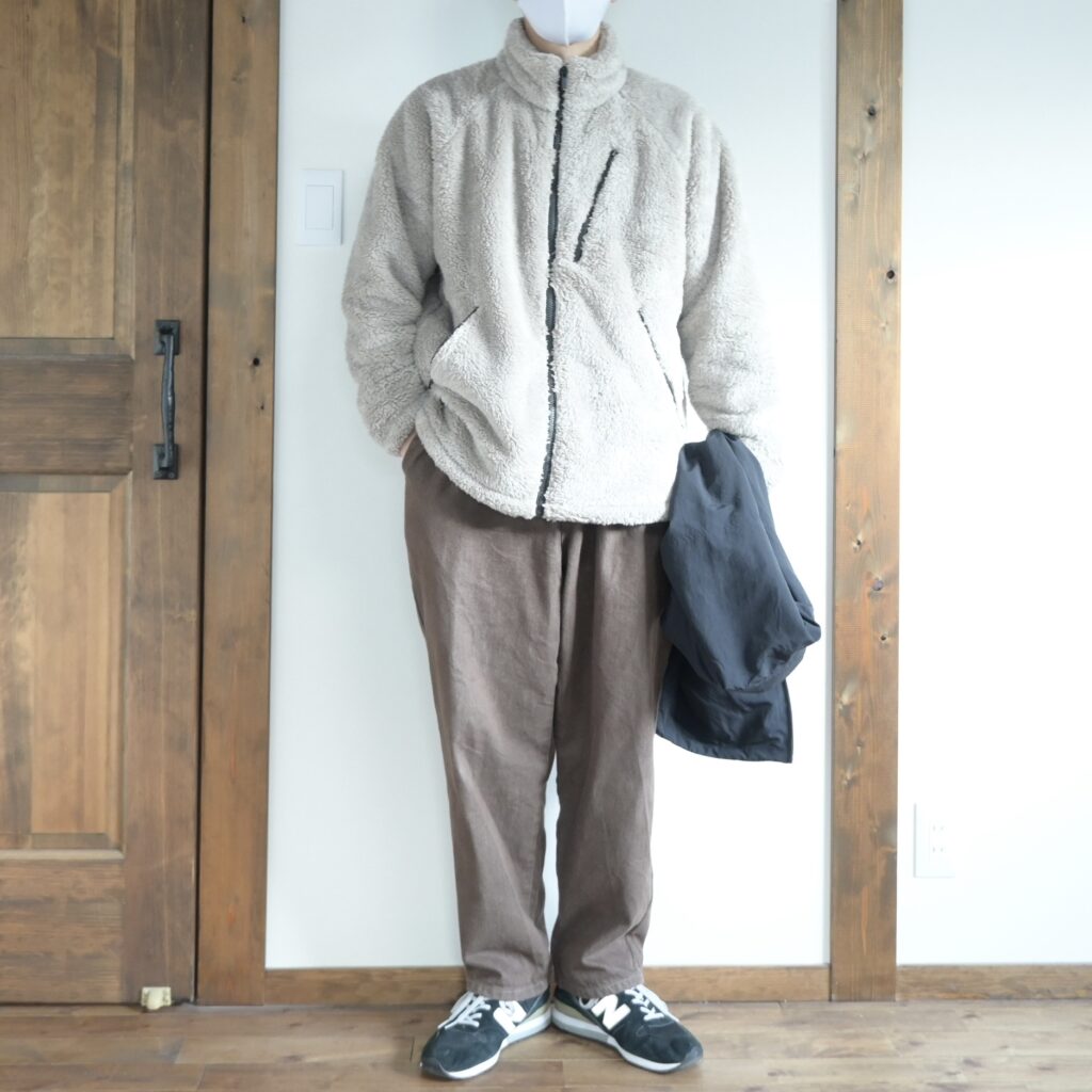 パンツはUで購入したコーデュロイのワイドパンツを合わせて全体的にオーバーサイズですが、NEEDLESのフリースはカジュアルにダボっと合わせるのが可愛いと思うので、こんな感じのコーデが増えるかなと思います。