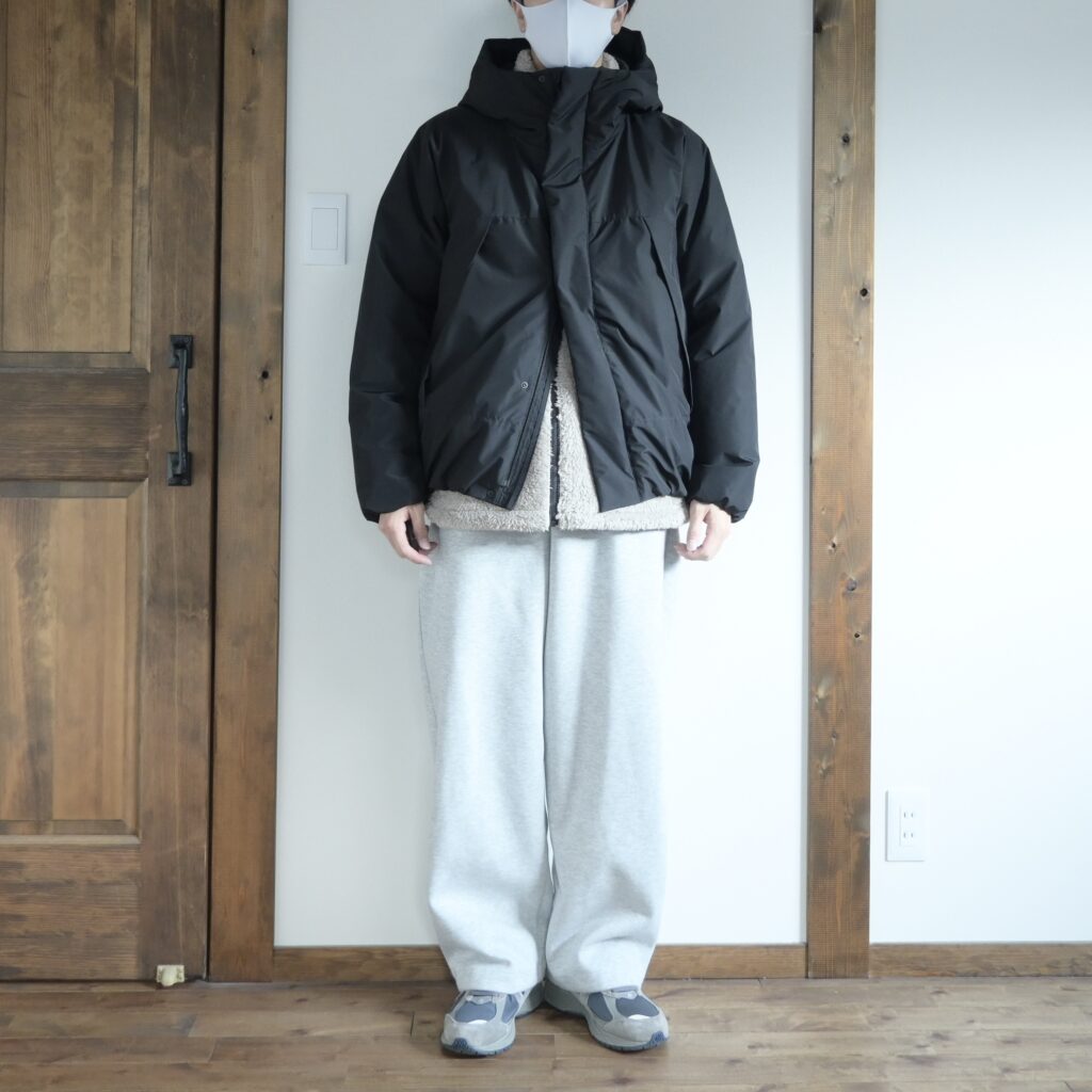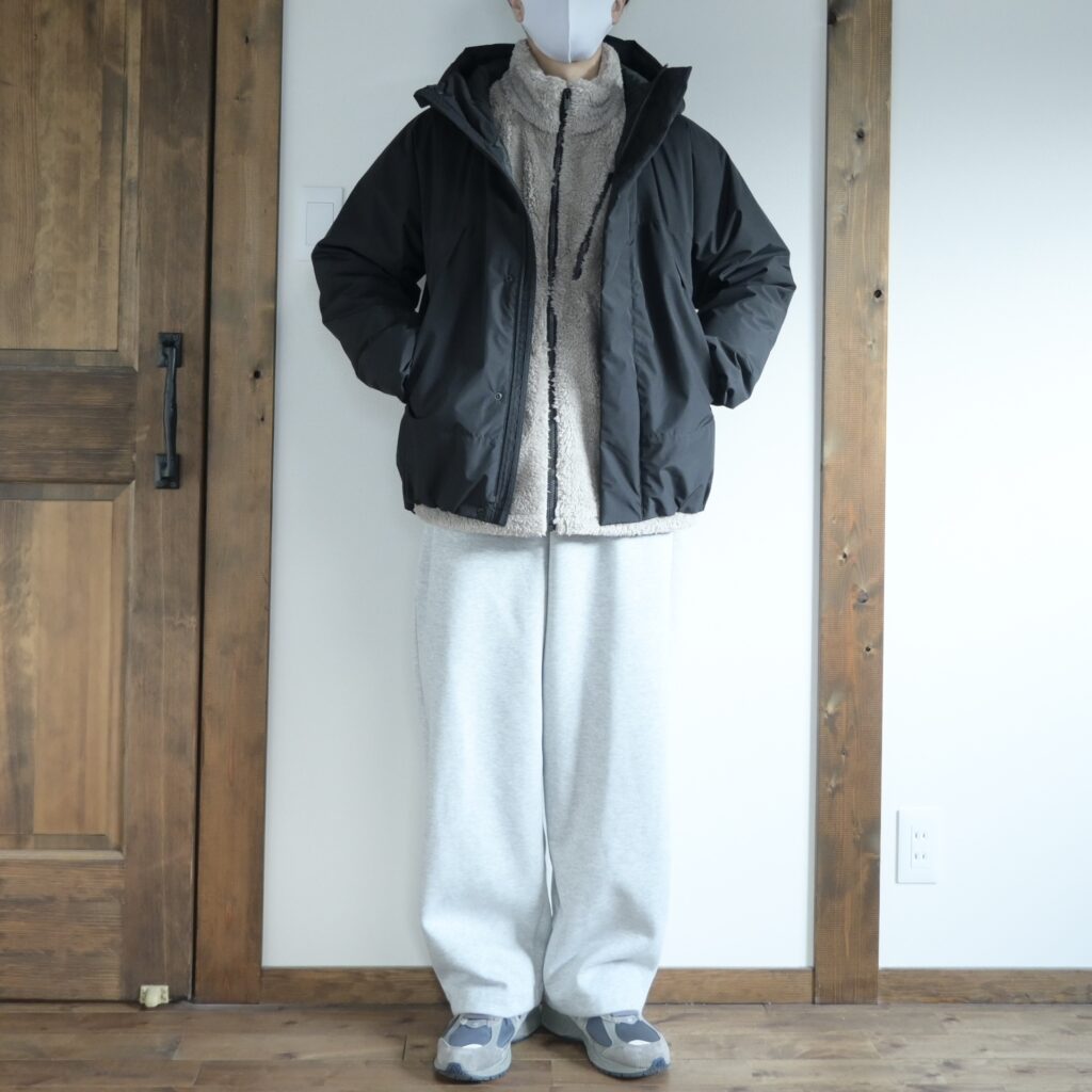 ゆったり目で膨張するアイテムなので、基本的にインナーとしては不向きだとは思うんですが、真冬にはそんなことも言ってられないので無印良品の中わたアウターの中に入れてみました。オーバーサイズな中わたアウターであれば、多少動きにくさは感じますが、まだ許容範囲かなと思います。