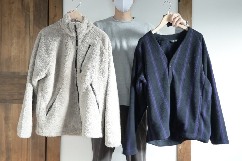 『フリースジャケット』『フリースオーバーサイズカーディガン』を使っていくつかコーデを組んでみました。参考になれば嬉しいです。