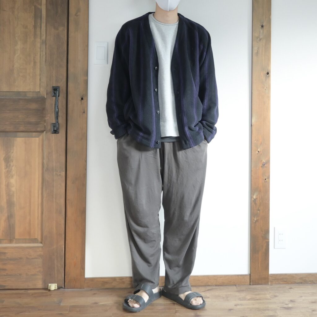 フリース生地のカーディガンなので、これくらいカジュアルでも良いかな?とやってみたんですが、スウェットとの相性が凄く良いですね。先ほどのようにシャツやスラックスに合わせるのも良いんですが、このカーディガンはスウェットやTシャツといったカジュアルなアイテムと合わせて着るのが一番しっくりくる気がします。