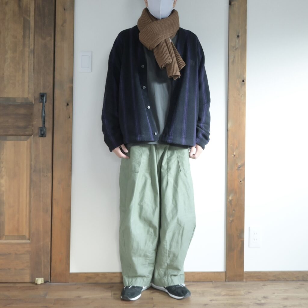 最後は本家NEEDLESの『ヒザデルパンツ』というめちゃめちゃ太いベイカーパンツに合わせてみました。