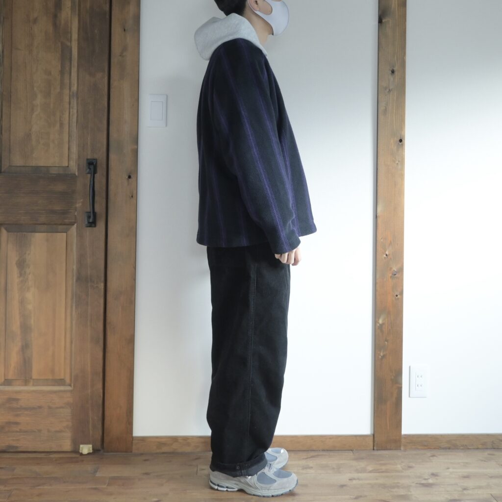 先ほどのフードジャケット同様に身幅は大きめですが、着丈が短いのでスッキリとしたシルエットで非常に使いやすいかなと感じました。Mサイズの方が僕の体型にはあっている気もしたんですが、パーカーなど厚手なアイテムの上からも着ることを考えてLサイズにしました。