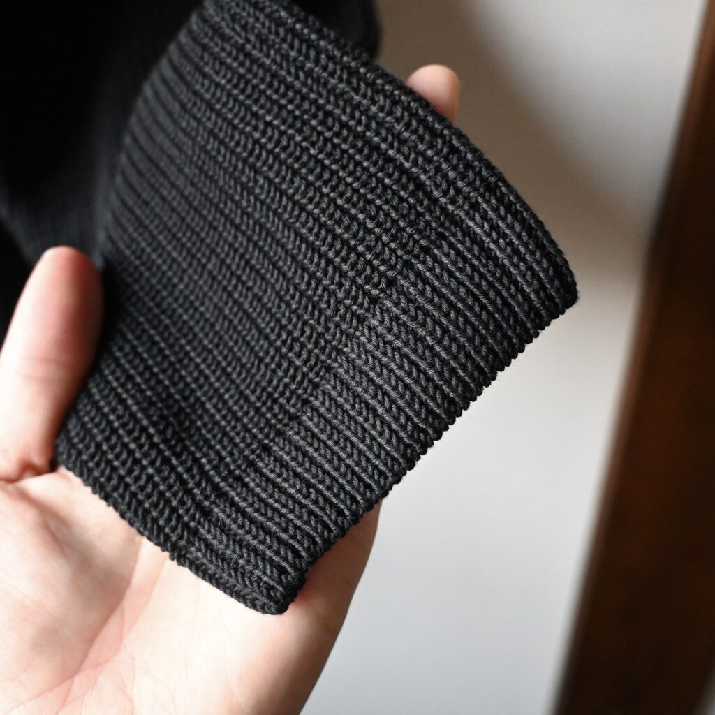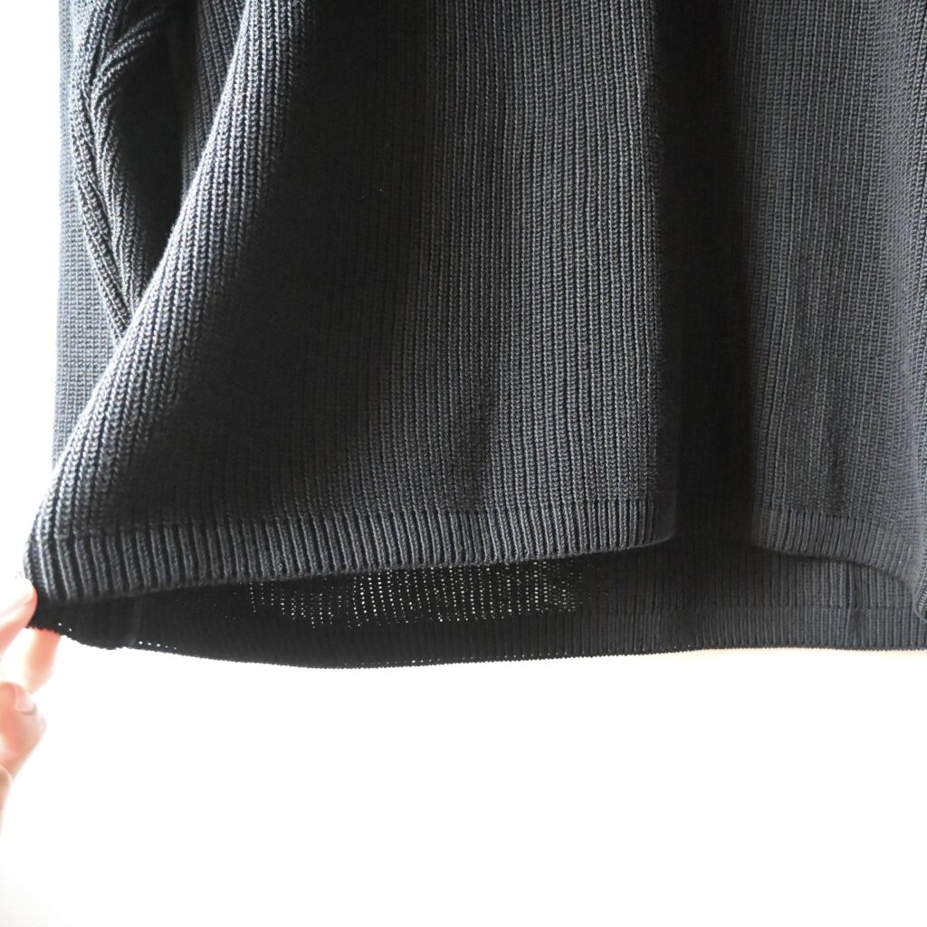 コットン100%のざっくりとしたローゲージ編みで、春らしい通気性の高い素材なんですが若干重いな…と感じました。こちらのニットは袖や裾口にリブが無いので、着てみた印象としてはロンTに近いように感じました。