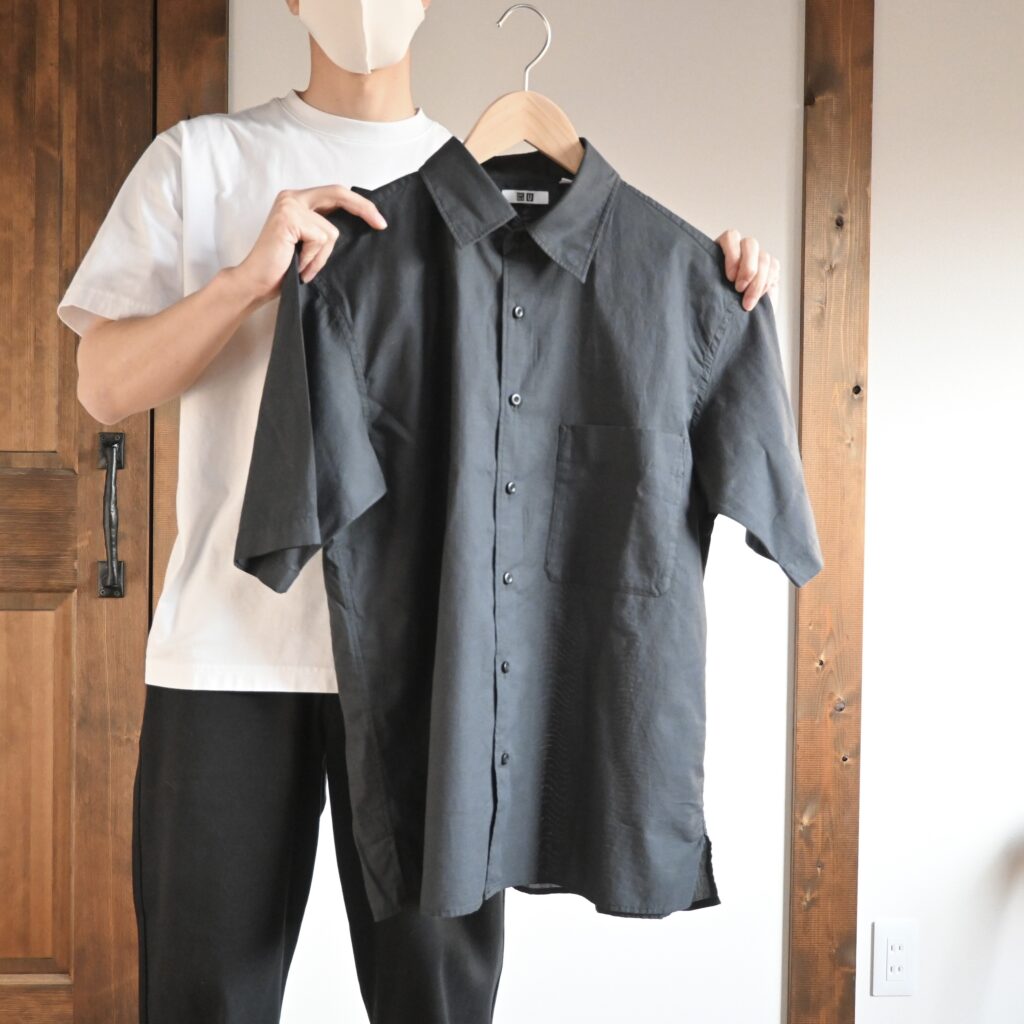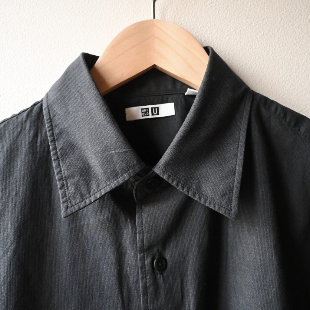 ブラックというよりダークグレーに近いスミ黒のような色合いで、UNIQLO Uらしい非常に大人っぽい落ち着いた色だなと感じました。価格も2,990円とお手頃なので、このシャツは夏に向けて1枚持っておきたいアイテムだと感じました。