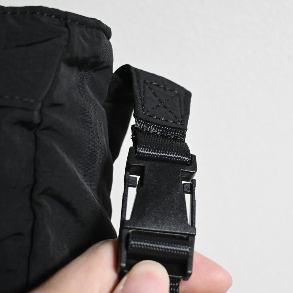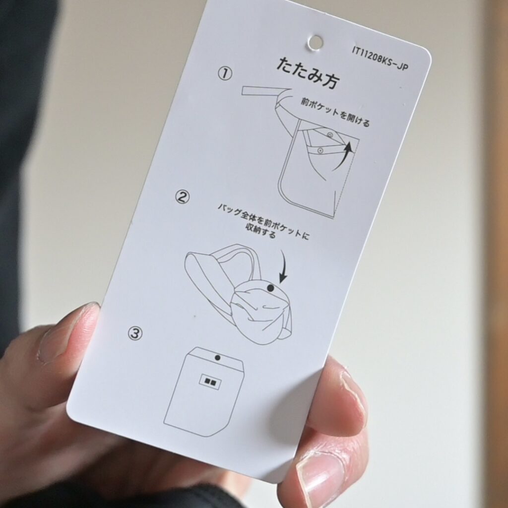ちなみに収納方法が商品タグに付いていたんですが、イマイチ分かりにくいなと感じました。バッグ外側に付いているどちらかのポケットを裏返すようにバッグ全体を押し込んでいくとコンパクトに収納出来ます。収納のポイントとしては、先にベルトをバッグの中に収納しておくことだと思います。
