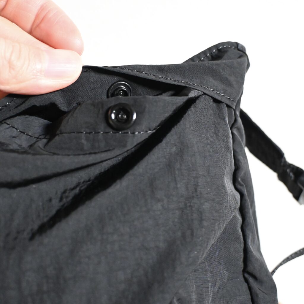 外側にはスナップボタンが付いていたポケットが2つ、内側にはメインの収納と間仕切りされたポケットが2つ付いています。ボディバッグの大きさで考えると充分な収納力だと思います。表面には撥水加工が施されているので、小雨程度であれば弾いてくれそうです。