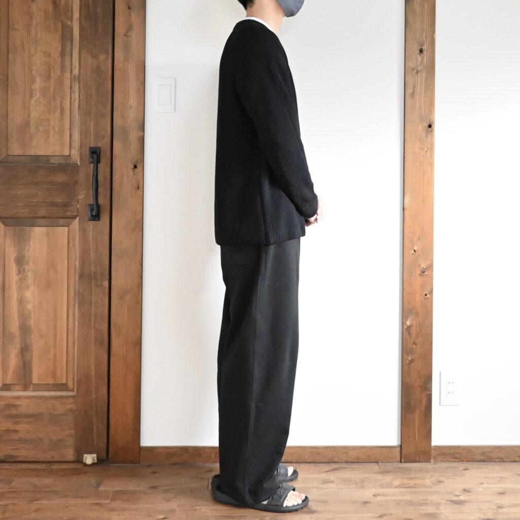 身幅が広くドロップショルダーなデザインですが、袖丈や着丈に関しては短めに感じました。