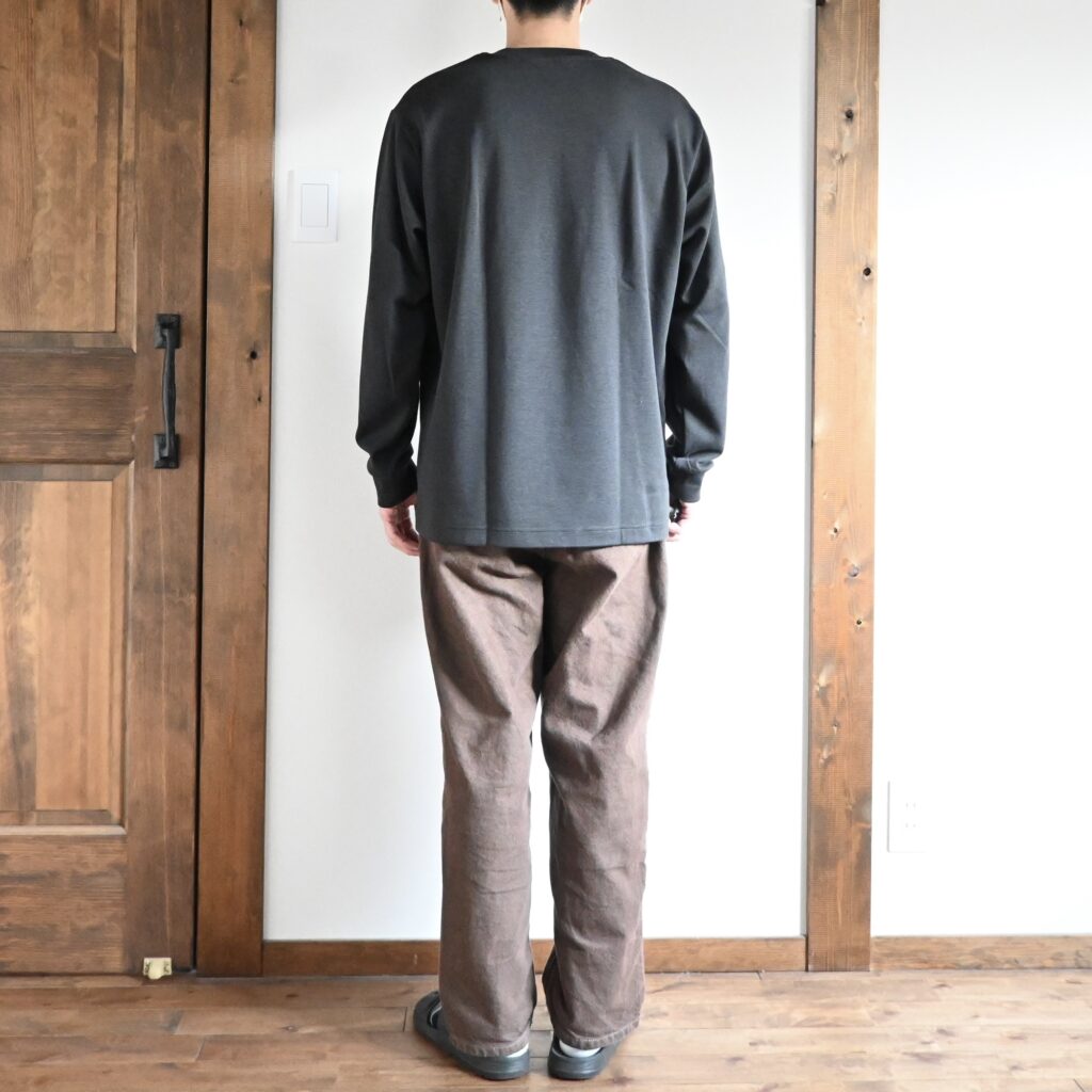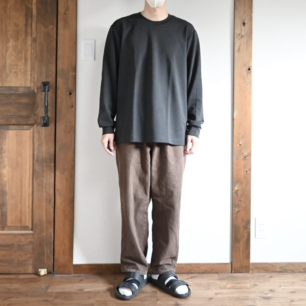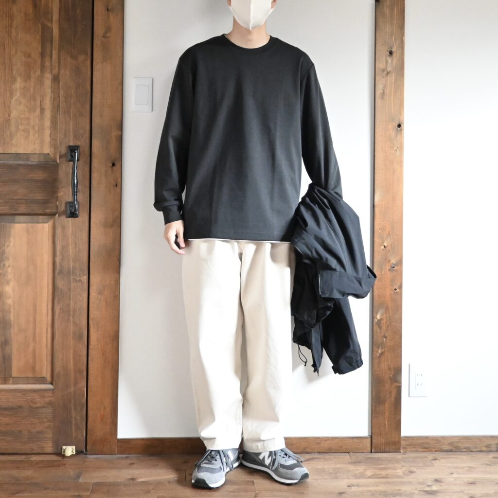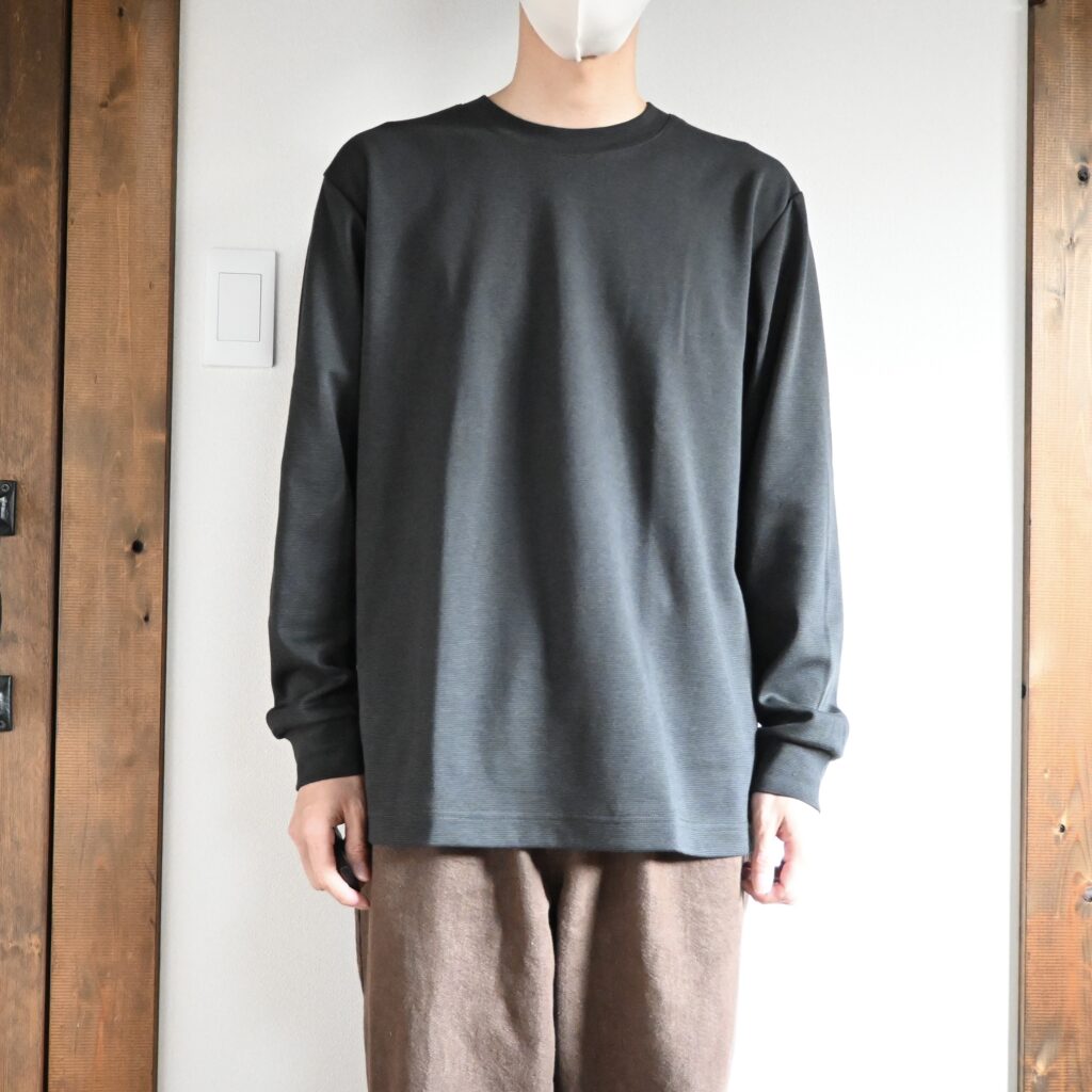サイズ感としては無地のタイプと全く同じなんですが、マイクロボーダーのブラックがとても大人っぽい色味だったのと、ゆったりめなサイズ感が相まって大人が使いやすいロンTだと感じたので、このボーダーTは非常にオススメ度の高いアイテムだと感じました。