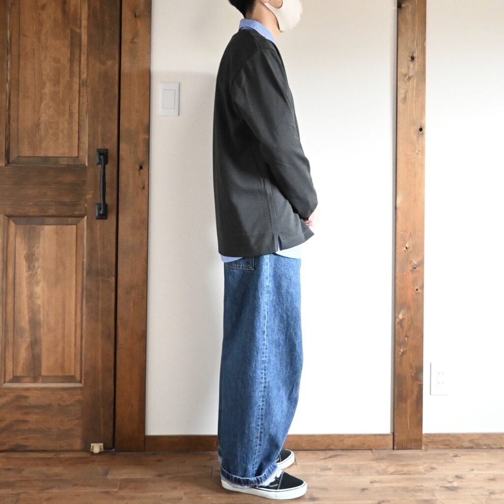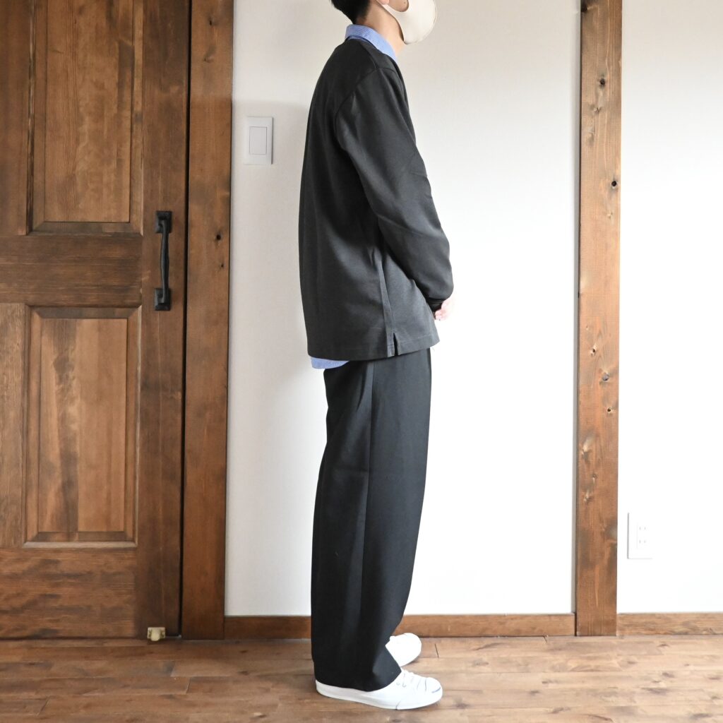Lサイズだと着丈が72.5cmと結構長めでしたが、ワイドパンツと合わせて着るとこの着丈の長さも逆にあっているように感じました。